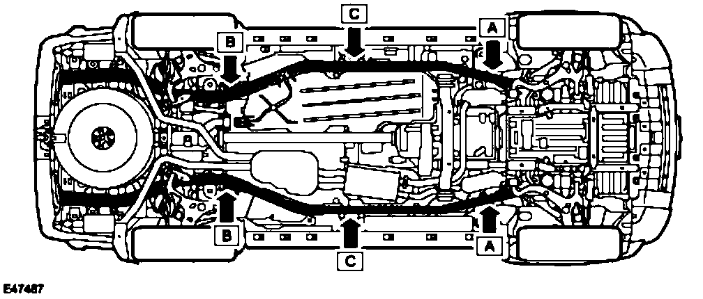 ^ Front and rear wheels - ONE SIDE - position lifting pad of jack beneath longitudinal member on the side to be raised at Point 'C'