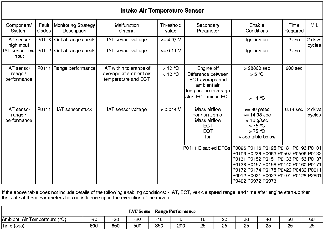 This monitor checks that the IAT sensor is not stuck at a particular value. If the airflow into the engine is over a threshold for greater than a calibratable time, then the IAT sensor reading is stored. The next time the airflow into the engine drops below a second threshold and the engine is idling, then a second timer is incremented. Once this timer reaches a pre-determined value, then the IAT sensor reading is stored again. The high flow temperature is subtracted from the low flow temperature and if the difference is greater than a threshold, then a normal judgement will be made. If the result is less than the threshold then a failure will be detected.