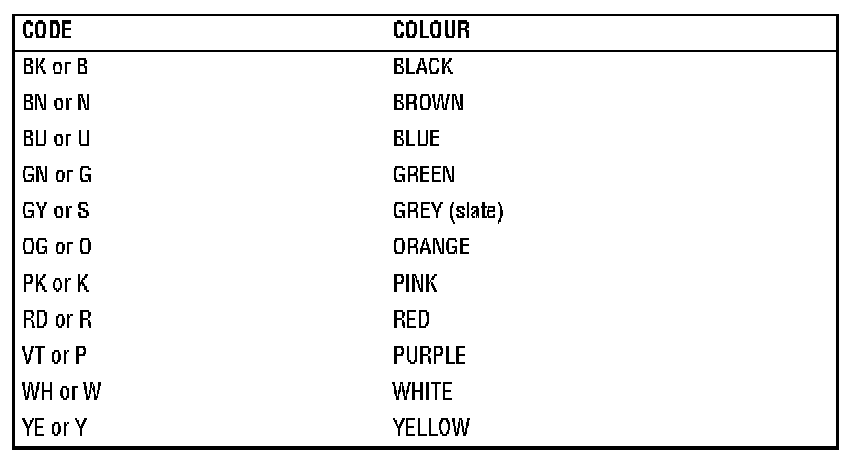 Connectors and header joints are identified by their corresponding connector number with a numbered suffix to indicate the pin-out detail of the wire, i.e. C0292-1 identifies connector 292, pin number 1. Wire insulation colors are listed in a table at the end of this section. Where wires have a predominant color with a secondary color tracer, the main color is identified first, i.e. WH-BK - white with a black tracer.