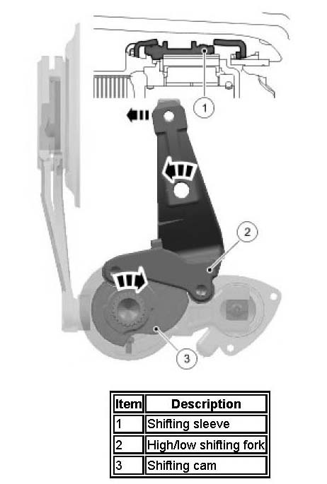 To actuate the high/low range change, the transfer box control module de-energizes the solenoid (3). A spring in the solenoid retracts the solenoid pin and rotates the solenoid shift fork (2). This engages the shifting sleeve (4) to the dogteeth on the high/low actuation cam (5). The rotational movement of the motor shaft (1) is then linked to the cam.