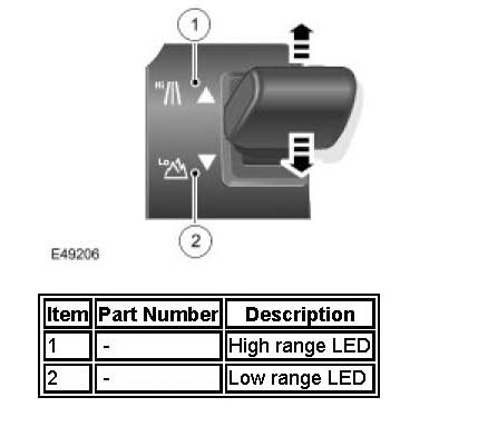 The 2 high/low range change LEDs adjacent to the range change lever are illuminated by the control module. The LEDs -one for each range - illuminate to indicate range change and status. The LED corresponding to the current selected range will be continuously illuminated. When a change of range is selected, the LED for the target range will flash when change commences, while the current range LED remains continuous. Once the target range has been achieved, the LED will be continuously illuminated-, the previous range LED will extinguish.