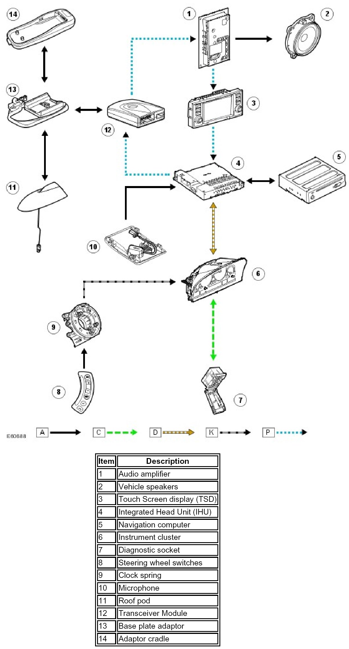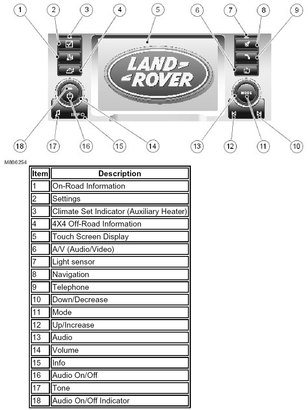 The TSD communicates with the Integrated Head Unit (IHU) on the MOST ring and provides the driver interface and driver display of the telephone system. The TSD also provides driver display and control of the audio, the rear view camera, the Venture Cam, the navigation system, the Traffic Message Channel and the rear seat entertainment.