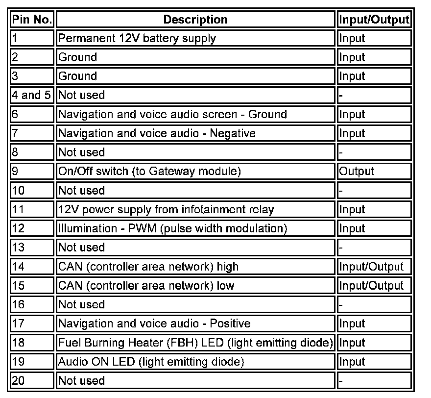 ^ Vehicle Signals The vehicle signals screen displays inputs from other vehicle systems. The screen shows the 'real time' parameters and status of the following: Battery voltage Lights (on/off) Ambient light sensor voltage Backlight dimming duty (PWM (pulse width modulation) %) Graphic illumination dimming duty (PWM (pulse width modulation) %) Output audio allocation (AM (amplitude modulation) /FM (frequency modulation) tuner, CD (compact disc), Navigation, DVD, TV) PCB Temperature Speed inhibit (overspeed) (on/off) MOST FOT temperature (degree C) Parking position (Park brake on/off) Backlight PWM (pulse width modulation) duty Beep volume Beep tone.