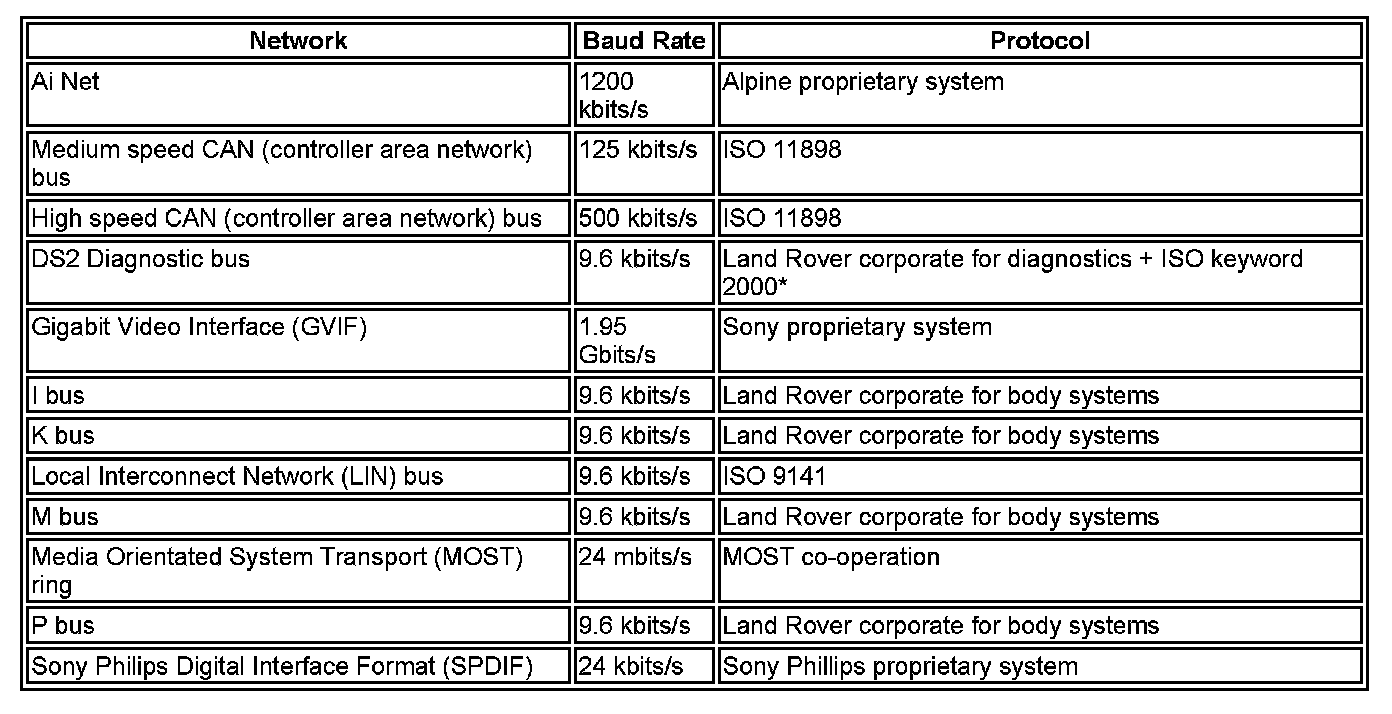 A number of different types of communication network are incorporated into the vehicle wiring harnesses for the transmission of commands and information between control modules. The configuration installed on a particular vehicle depends on the model and equipment level.