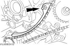 ^ Install the LH secondary timing chain tensioner and timing chain to the camshaft sprockets.