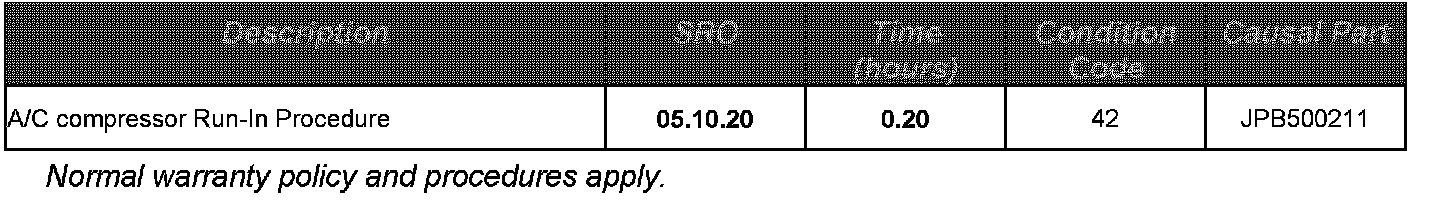 An issue has been identified where the Air Conditioning (A/C) compressor may 'seize' at very low mileage (less than 50 mi / 80 km). This may be caused from oil migrating from the A/C compressor into the A/C system pipes and not returning in time to provide full lubrication.