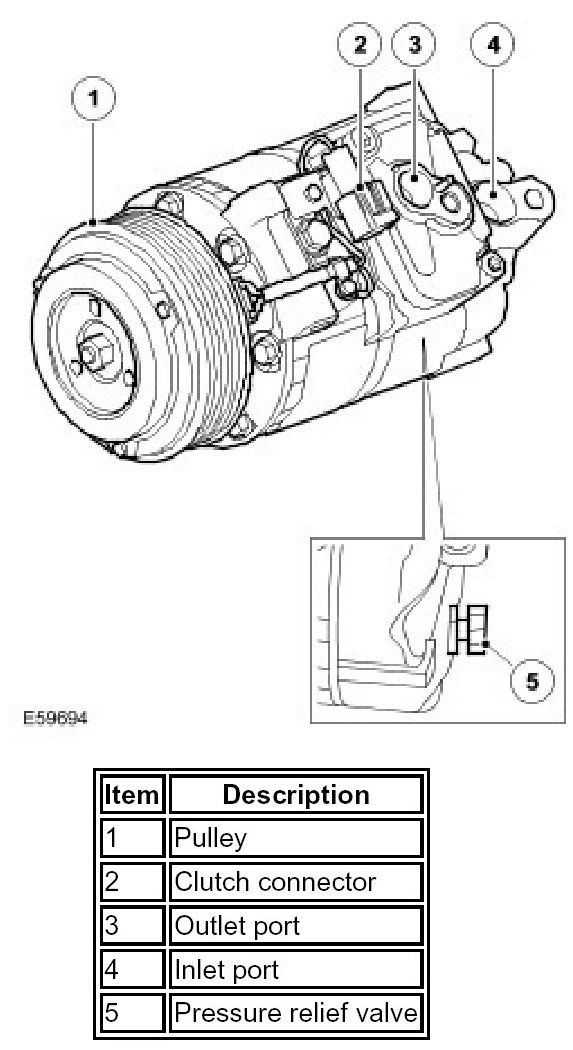 The A/C (air conditioning) compressor fitted to both petrol and diesel vehicles is a variable displacement unit. The secondary accessory drive belt, driven by the engine crankshaft, drives the A/C (air conditioning) compressor via a pulley and an electromagnetic clutch. Operation of the clutch is controlled by a power feed from the ATC (automatic temperature control) module.