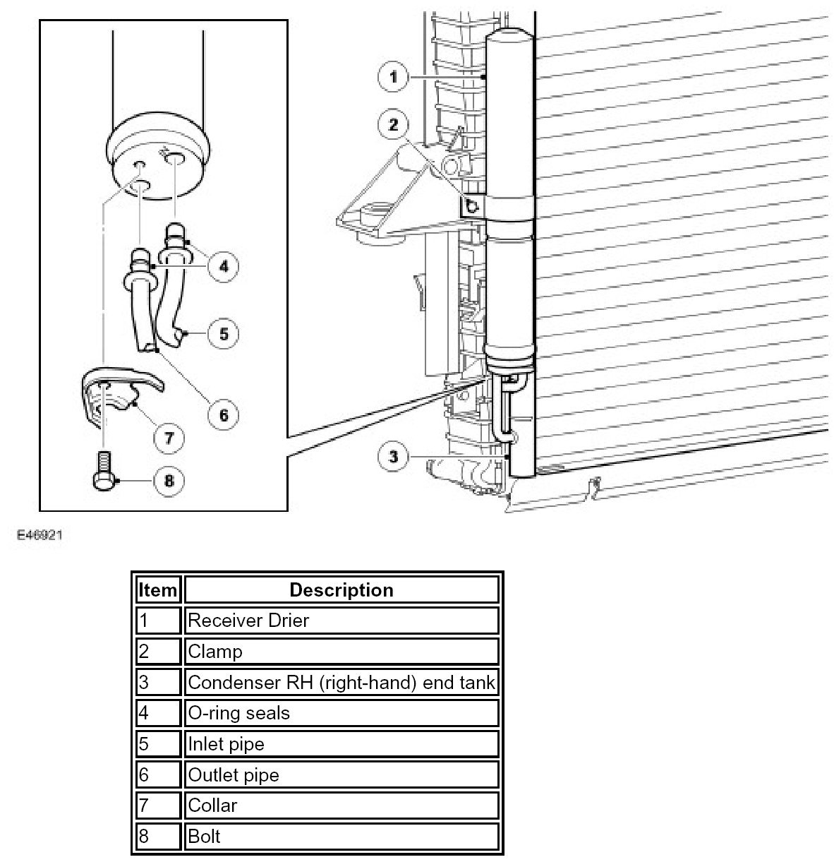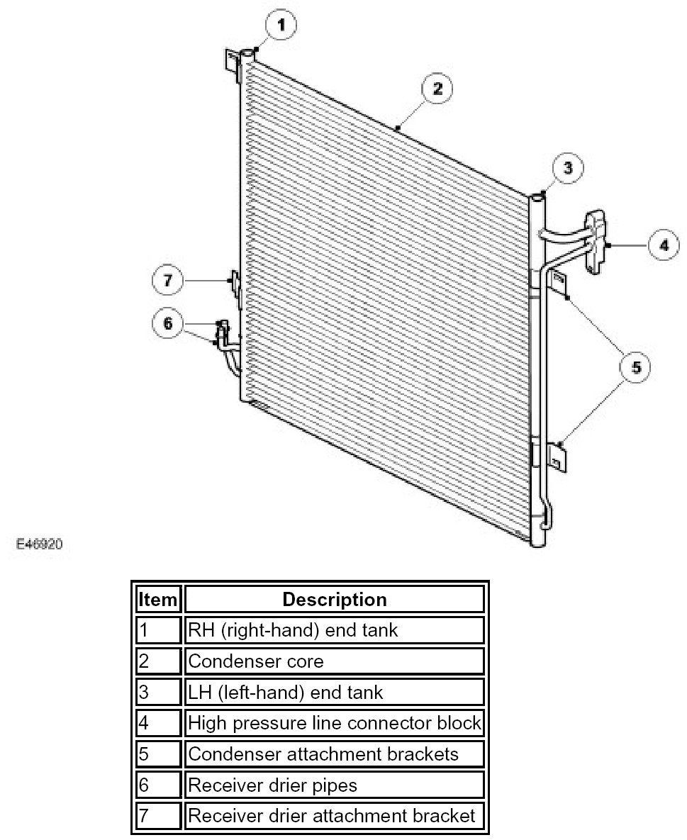 The condenser transfers heat from the refrigerant to the surrounding air to convert the vapor from the A/C (air conditioning) compressor into a liquid. A receiver drier module, integrated onto the LH (left-hand) side of the condenser, incorporates a filter and a desiccant to remove solid impurities and moisture from the refrigerant. The receiver drier module also functions as a reservoir for liquid refrigerant, to accommodate changes of heat load at the evaporator.