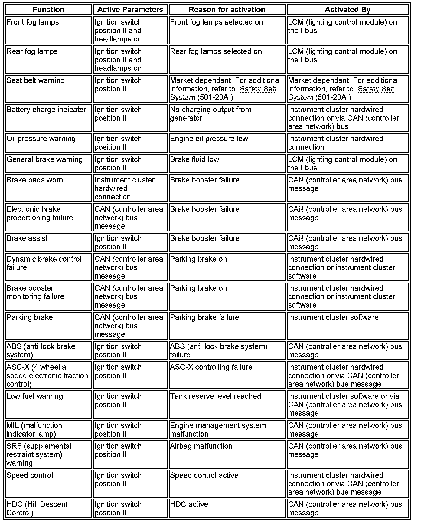 The following indicators are illuminated directly by the instrument cluster logic or by other control modules connected to the instrument cluster. The following table shows the indicator functionality.