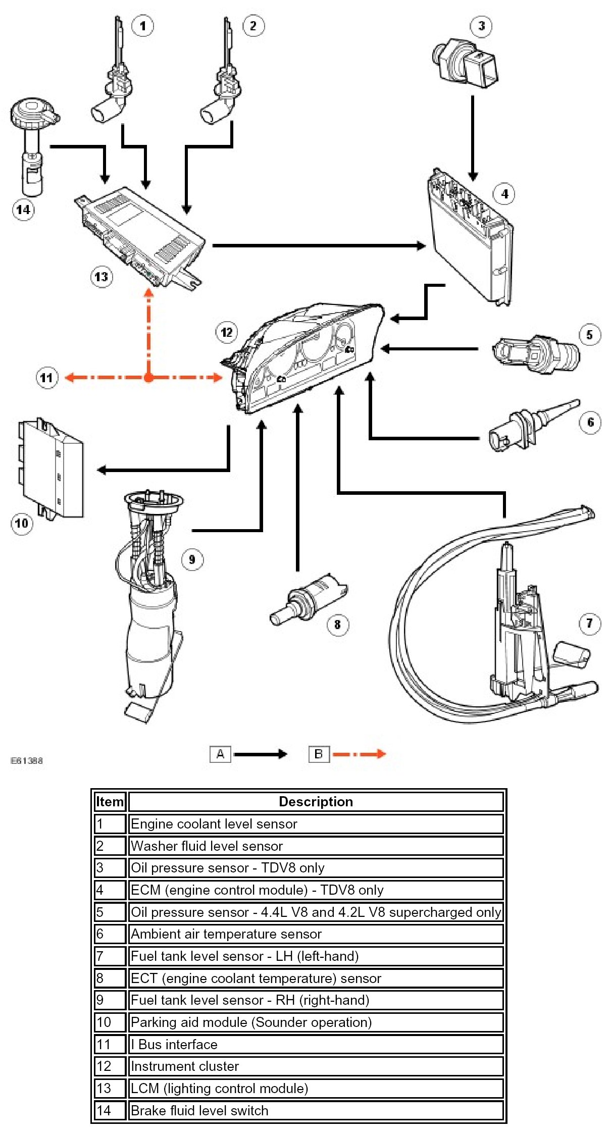 - The brake fluid reservoir is fitted with a sensor which reports the fluid level to the LCM (lighting control module). When the ignition is switched to position II, the LCM (lighting control module) checks the fluid level immediately. To prevent false warnings when the vehicle is moving, the LCM (lighting control module) then monitors the fluid level with a 25 second delay. If the LCM (lighting control module) detects a low brake fluid situation the LCM (lighting control module) displays 'CHECK BRAKE FLUID' in the message center. Simultaneously, a message is sent to the instrument cluster which evaluates the message via the cluster software and illuminates the general brake warning indicator in a red color, accompanied by an intermittent chime from the sounder.