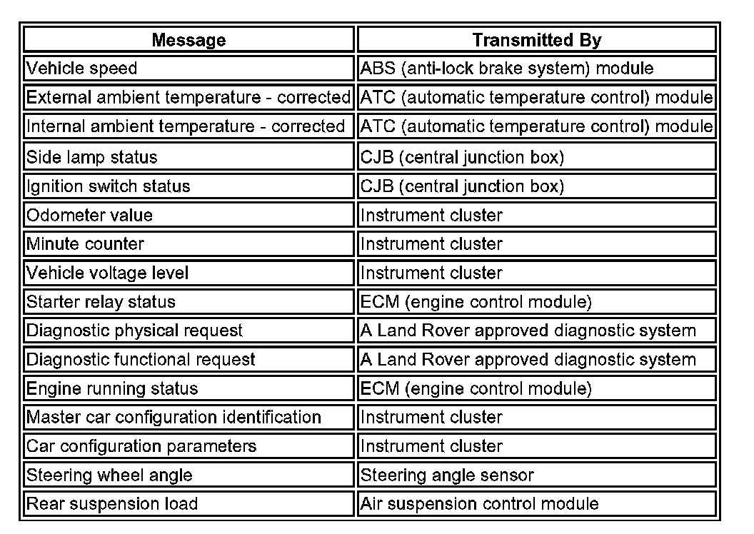 The TPMS module sends and receives a number of digital messages via the medium speed CAN (controller area network). The received messages are used for the operation of the TPMS. The transmitted messages comprise of TPMS status and requests to the instrument cluster to illuminate warnings indicators and/or display messages in the message center.