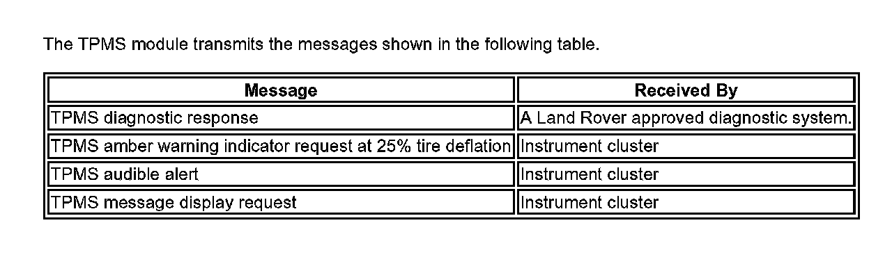 The TPMS module transmits the messages shown in the following table.
