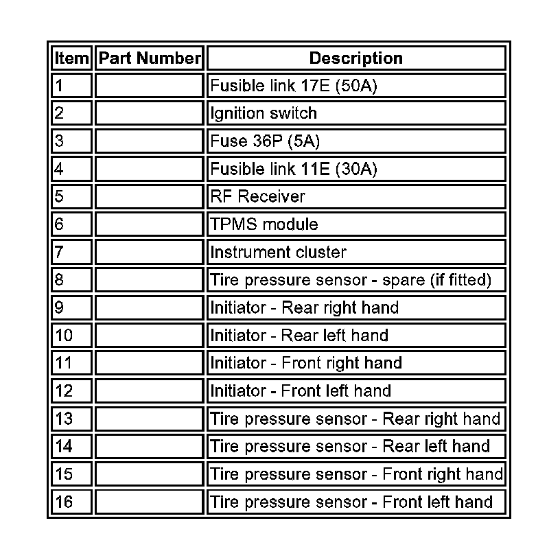 Each time the vehicle is driven, the TPMS module transmits a Low Frequency (LF) (125 KHz) signal to each initiator in turn. This is received by the tire pressure sensor which transmits a Radio Frequency (RF) (315 or 433 MHz depending on market) signal to the RF receiver. This signal contains coded data which corresponds to sensor identification, air pressure, air temperature and acceleration data. This signal is communicated to the TPMS module via a LIN bus.