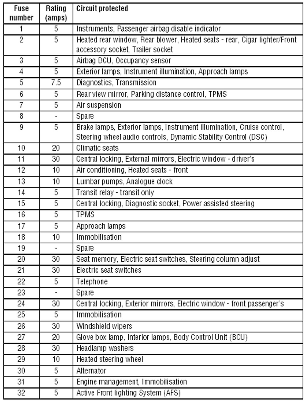 A label in the fuse box cover shows the circuits protected, the fuse values and their locations.