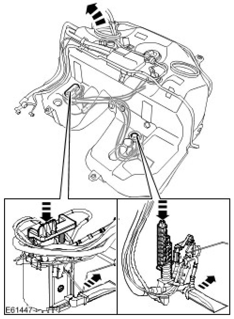 ^ Depress the clips and release the lower part of the pump and sender unit rearward.