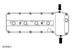 4. NOTE: Apply two beads of silicone gasket sealant as shown on the illustration. The application of the sealant must be 3mm diameter 12mm long. Install the valve cover immediately after applying the sealant. The cover should be fitted directly to the head without smearing the sealant or the seals.