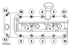 ^ Remove the 14 valve cover retaining bolts.