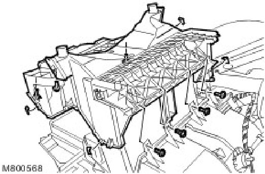 14. Remove the heater and evaporator core housing lower cover.