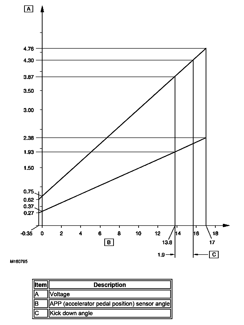 The APP (accelerator pedal position) sensor has two potentiometer tracks which each receive a 5V input voltage from the ECM (engine control module). Track 1 provides an output of 0.5V with the pedal at rest and 2.0V at 100% full throttle. Track 2 provides an output of 0.5V with the pedal at rest and 4.5V at 100% full throttle. The signals from the two tracks are used by the ECM (engine control module) to determine fueling for engine operation and also by the ECM (engine control module) and the TCM (transmission control module) to initiate a kickdown request for the automatic transmission.