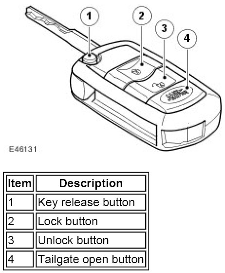 On vehicles from 2007MY the remote handset changed to a folding blade type. The blade is released from the stowed position by pushing the key release button on the remote handset. The battery on this type of key is non-serviceable and recharges while the engine is running. If the battery charge is low, the remote operating range is reduced. The battery has a nominal life of 14 years.