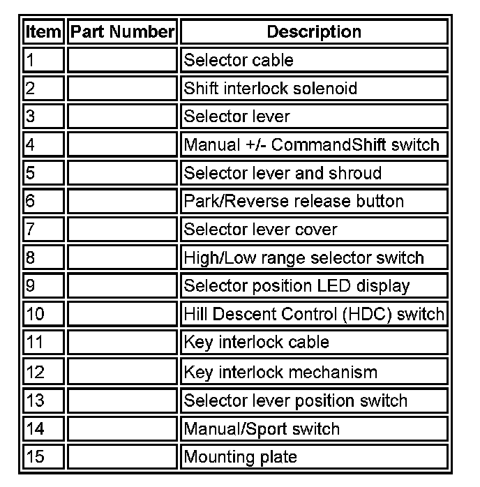 The shift interlock solenoid is located at the front of the selector lever assembly. The selector lever is connected to a locking plate which has two holes which correspond to the 'P' and 'N' positions. When the ignition is on or the engine is running, the solenoid is energized by the TCM (transmission control module) when the selector lever is in the 'P' or 'N' positions. When energized, the solenoid ejects a pin which engages in the locking plate preventing the lever from being moved.