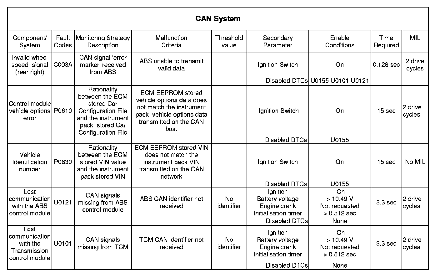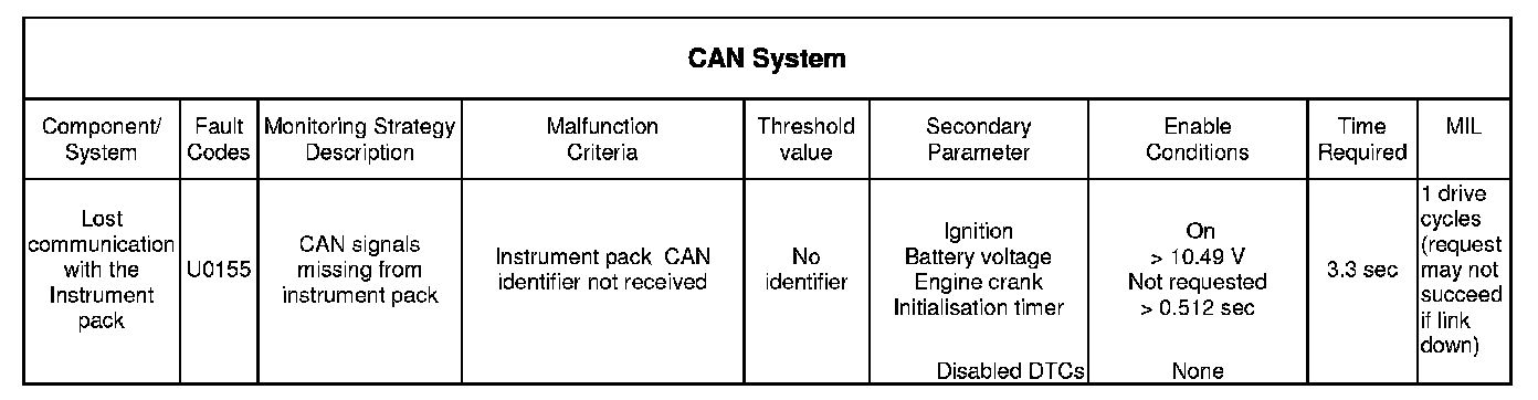 The Controller area network (CAN) system is monitored by the ECM for the following conditions.
