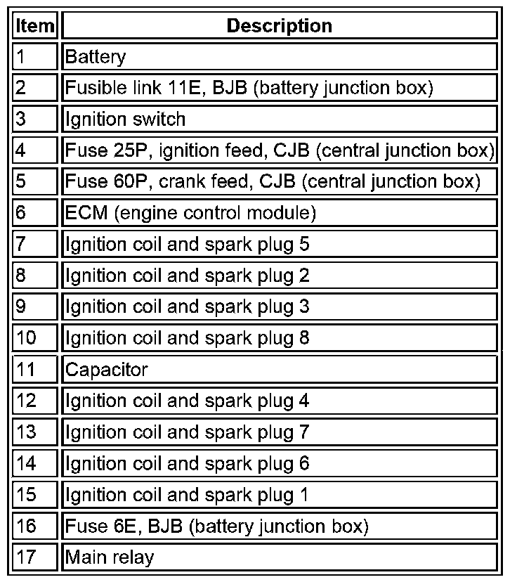 Power for the ignition coils is supplied from the main relay and a fuse in the BJB (battery junction box). A capacitor is connected in parallel with the power supplies to the ignition coils to suppress RFI (radio frequency interference).