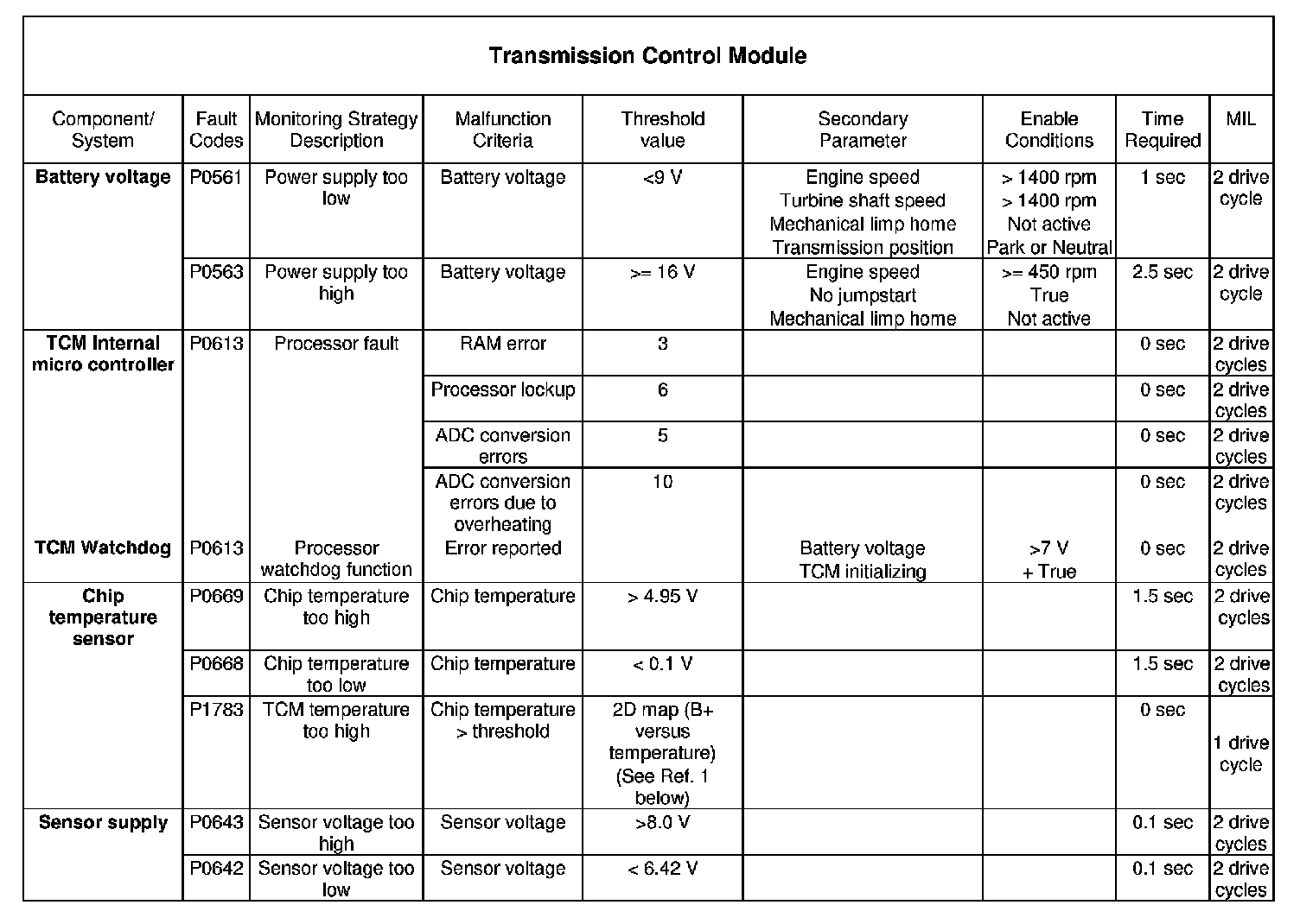 4. The internal TCM chip temperature exceeds a variable temperature threshold depending battery supply voltage. The TCM is situated within the transmission on the valve body. As the TCM controls a number of high power solenoids and is surrounded by transmission fluid it can get very hot. If the temperature of the hardware rises above a pre-determined level, the TCM will be shut down. Prior to the TCM shutting down it will log a fault code, during shutdown the transmission will enter mechanical limp-home mode. A temperature dependent resistor mounted on the processor performs monitoring of the chip temperature.