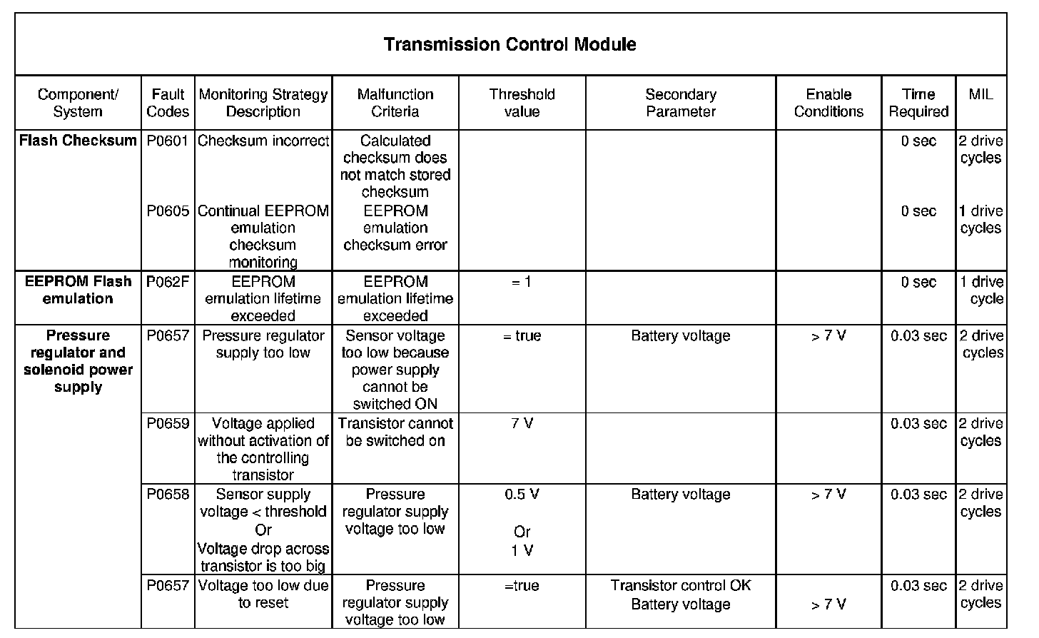 11. The supply from the TCM to the pressure regulators and shift solenoid cannot be maintained at the correct level. A field effect transistor (FET) is used to control the power supply to the pressure regulators and shift solenoid, this group of checks monitors both the transistor operation and the resulting output voltage to the solenoids for correct operation. Five DTCs are used to identify the exact nature of the failure.