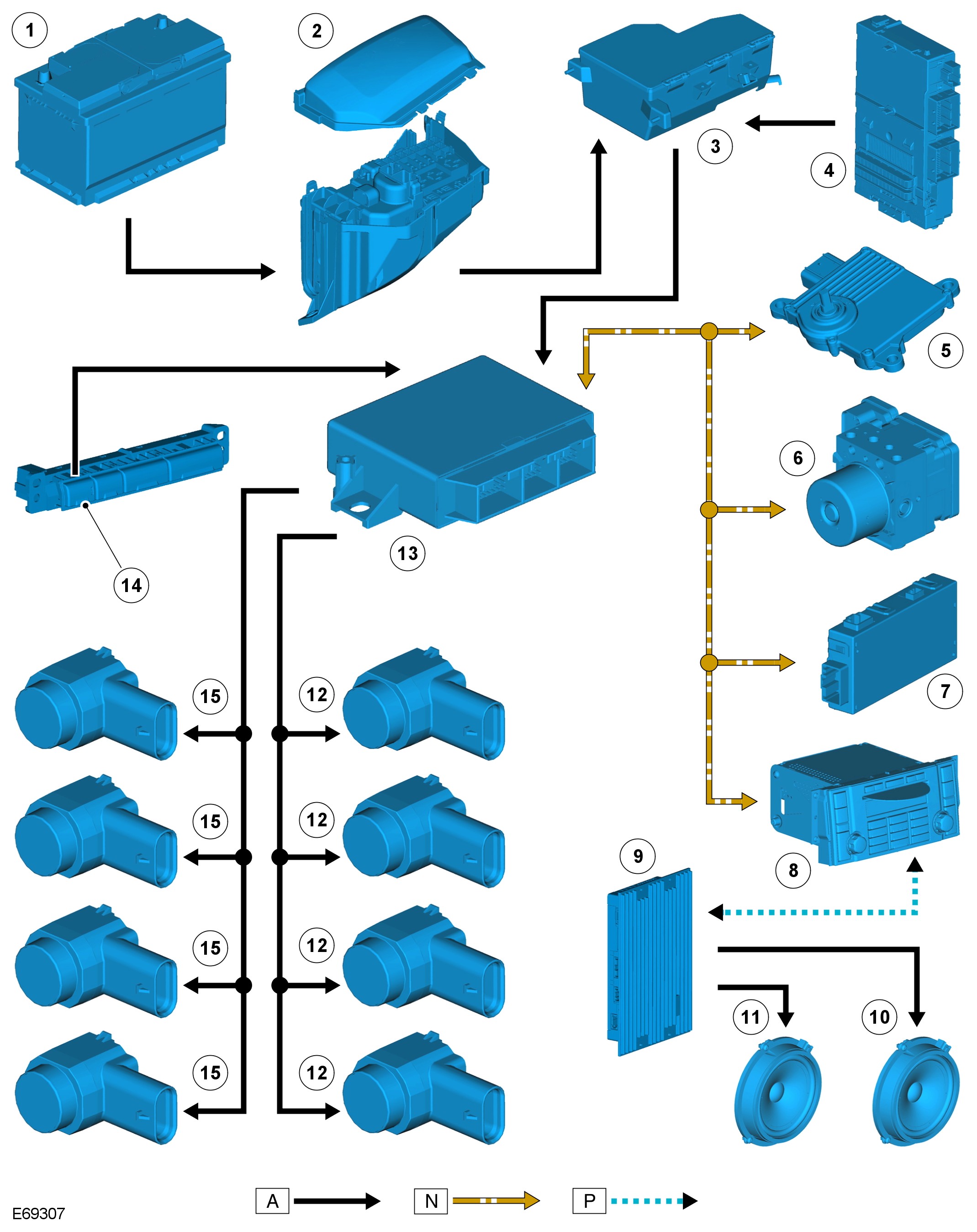 The parking aid module communicates via the medium speed Controller Area Network (CAN) bus with the audio system via the Integrated Control Module (ICM). The audio system then outputs the applicable warning tones from the front or rear speakers when an object is detected. The medium speed CAN bus is also used to collect vehicle data from other vehicle systems.