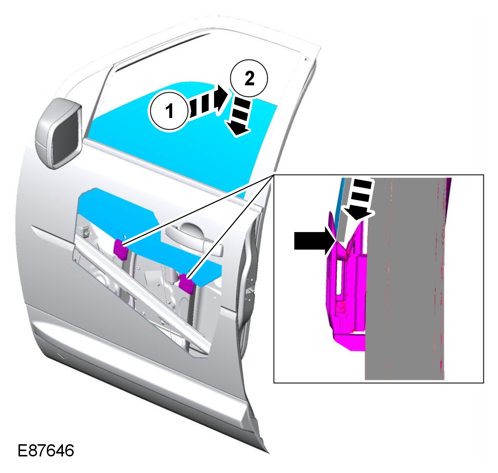 2 To secure the door glass to the door glass mechanism, lower the glass squarely to rest within the latches. With slight pressure applied to top of glass as shown, push the glass down to fully engage.