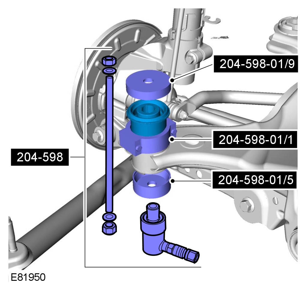 CAUTION: Special tool 204-598-01/8 is used to start the bushing removal process, and must be removed after the bushing has released, as it will not pass through the subframe bushing aperture.