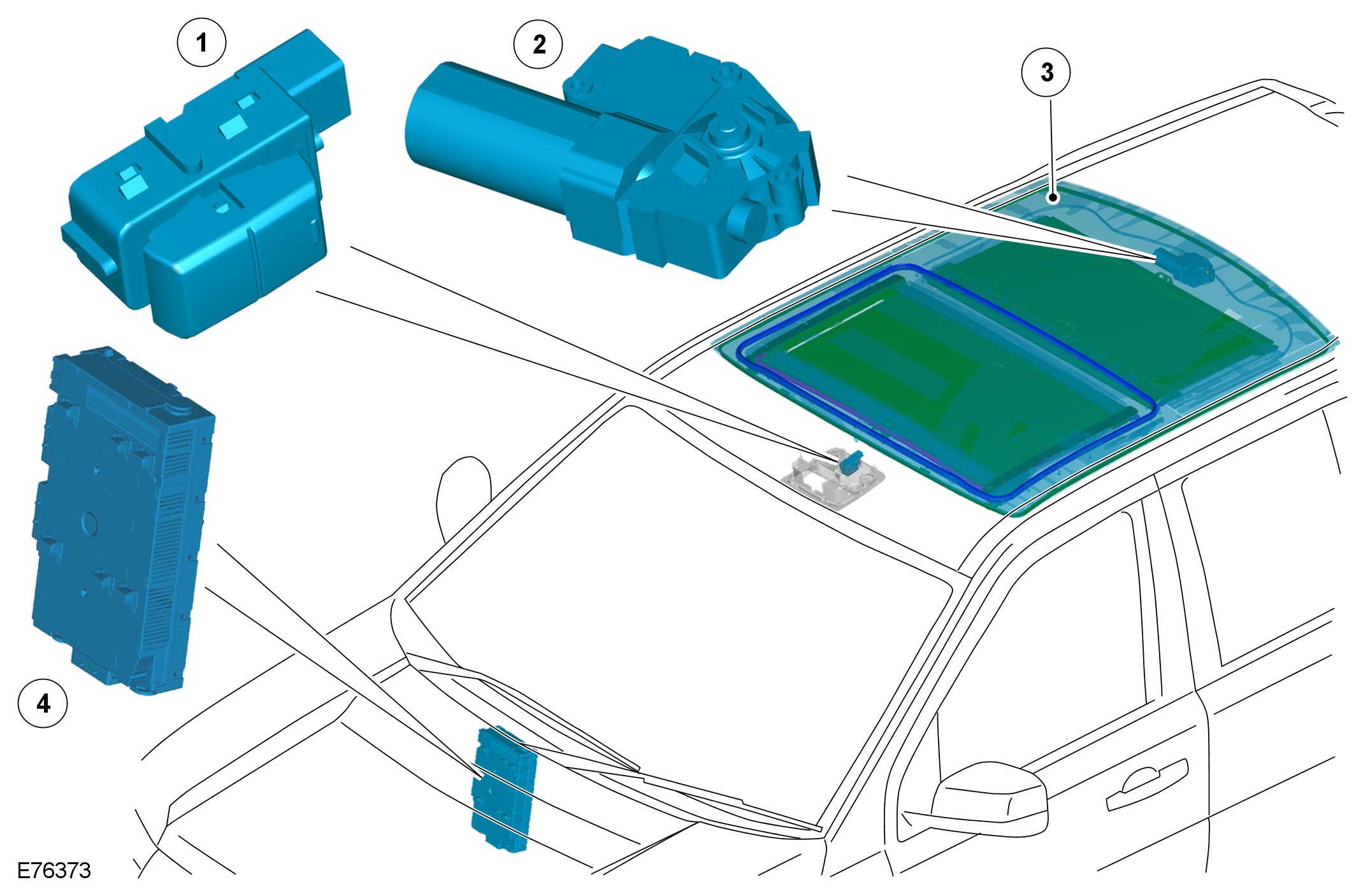 The front half of the roof opening panel is electrically operated through a 2 way rocker switch located in the roof console. An electric motor, attached to the rear of the roof opening panel frame, drives the front glass panel to the tilt, open or closed position. The glass panel is operated by 2 cables, which are driven by the motor.