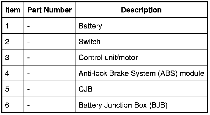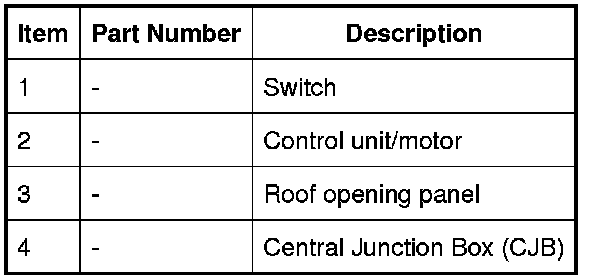 The roof opening panel will only operate when the vehicle is in power mode 6 (ignition on). Power is supplied to the roof opening panel control unit/motor by the CJB, which supplies both a permanent battery and ignition power supply. The CJB also provides a vehicle speed signal to the control unit.