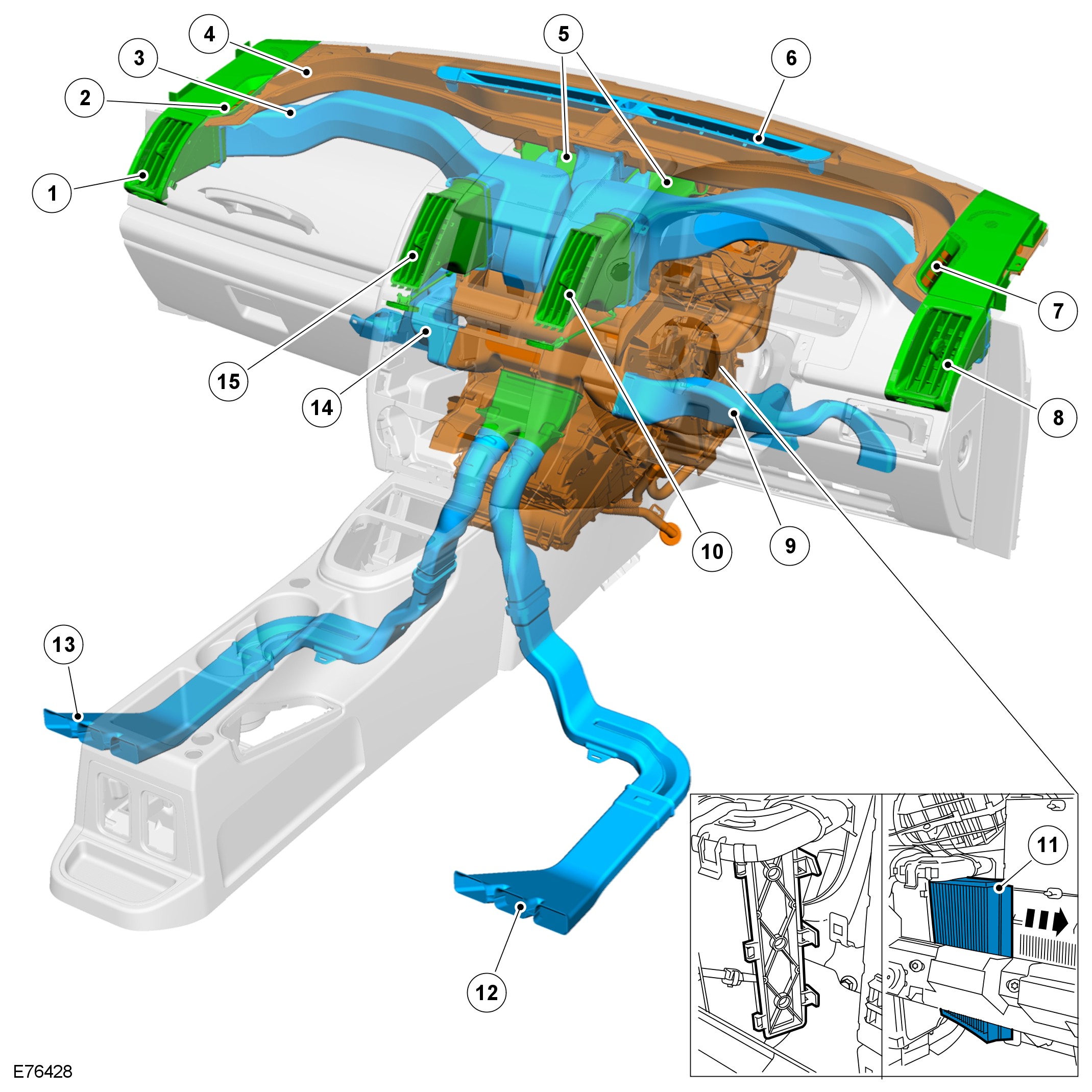 The cabin air filter is located behind the RH side of the instrument panel and is housed within the heater assembly. The filter removes odors and fine particles, including pollen, from the air entering the heater assembly.