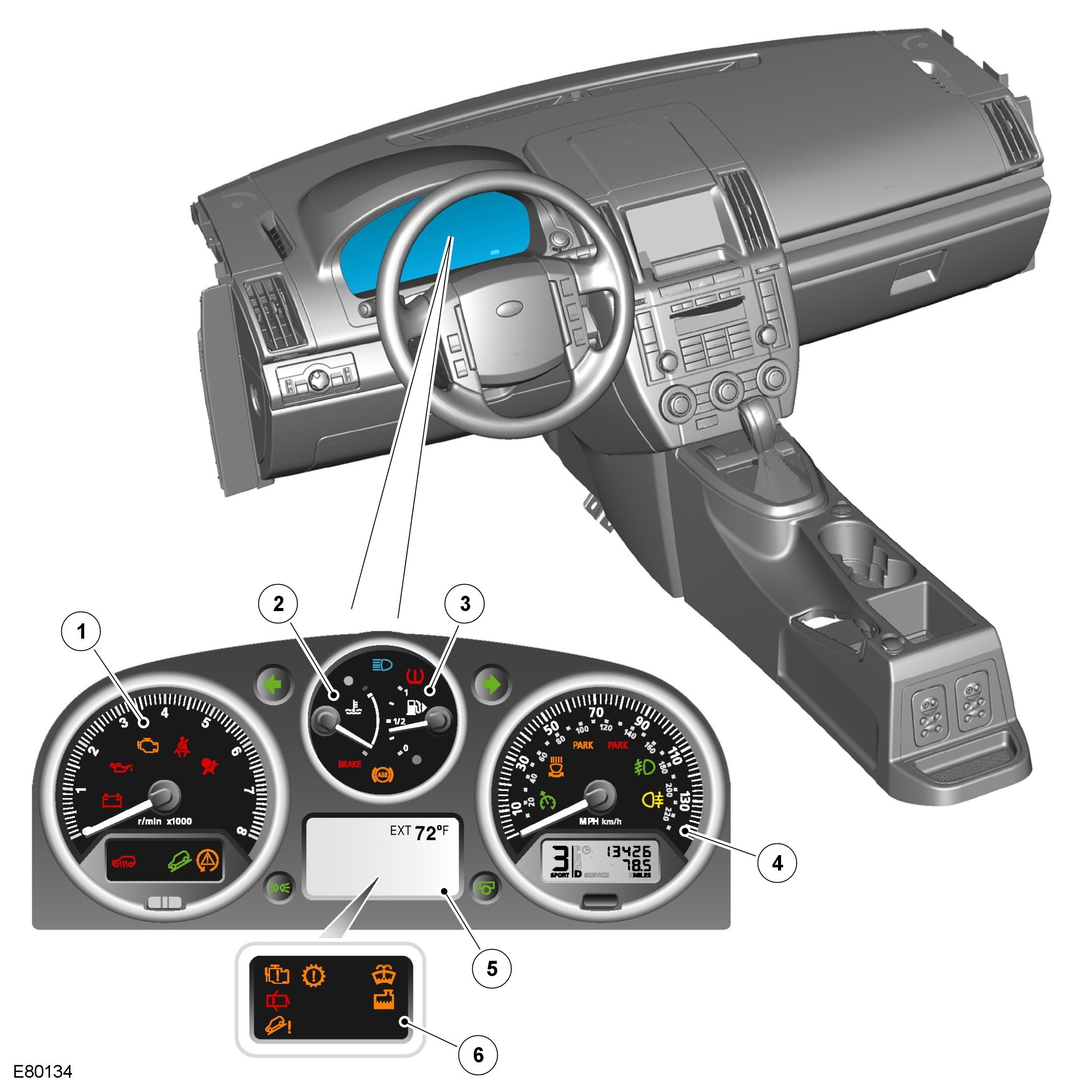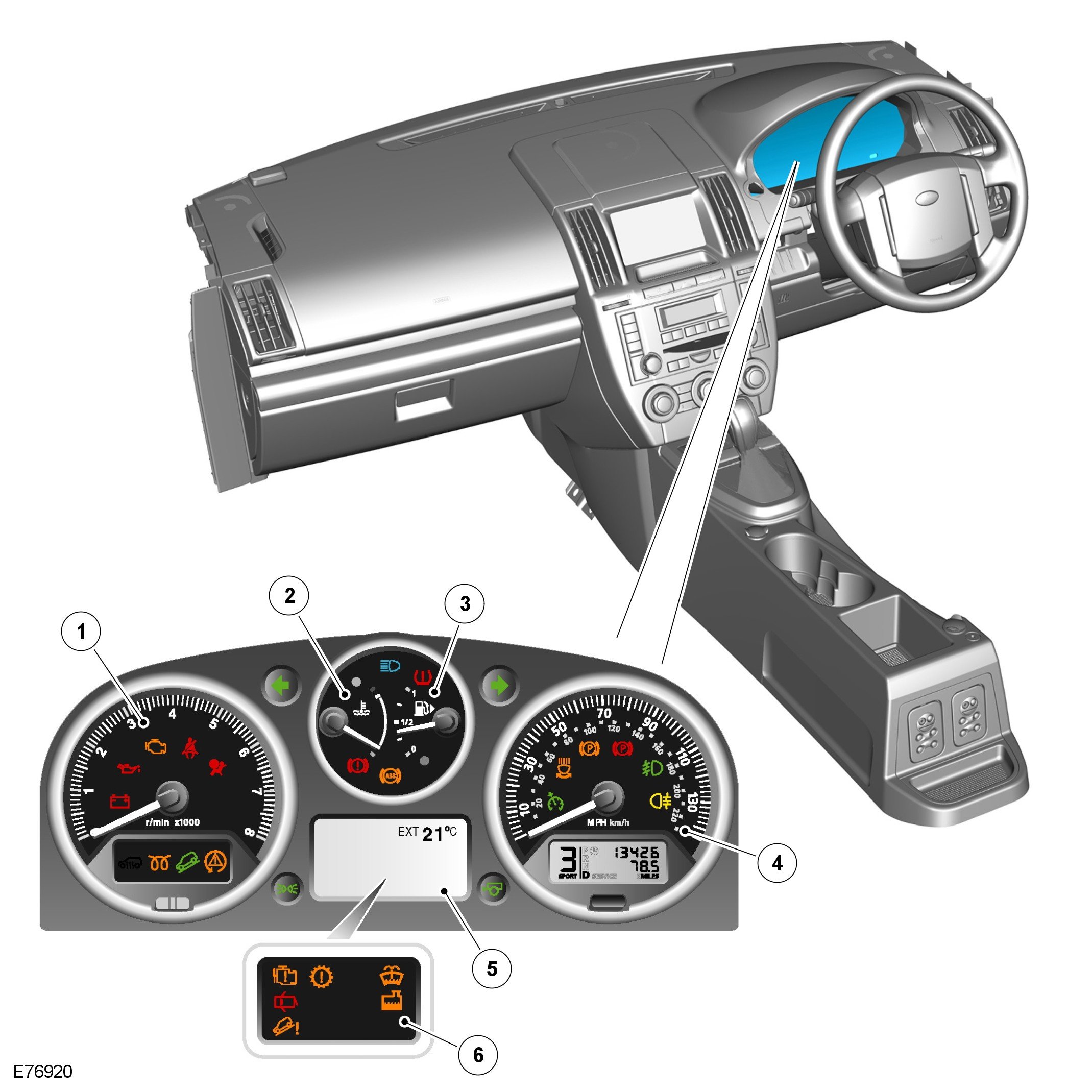 The instrument cluster is located in the instrument panel, above the steering column. The instrument cluster comprises analogue gages and a number of warning indicator lamps to display system status. High line instrument clusters also feature a Liquid Crystal Display (LCD) message center to provide vehicle operation details to the driver. The message center is located in a central position in the high line instrument cluster. For additional information, refer to Information and Message Center Description and Operation Low line instrument clusters feature warning indicator lamps in place of the message center.