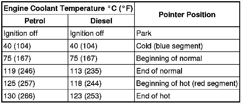 If the ECT signal rises above 118 °C (244 °F) on diesel vehicles, or 127 °C (260 °F) on petrol vehicles, the instrument cluster will illuminate the high ECT warning indicator. If the instrument cluster fails to receive an ECT signal from the CJB, the engine coolant temperature gage will move to the 'end of hot' position and the warning indicator will be illuminated.