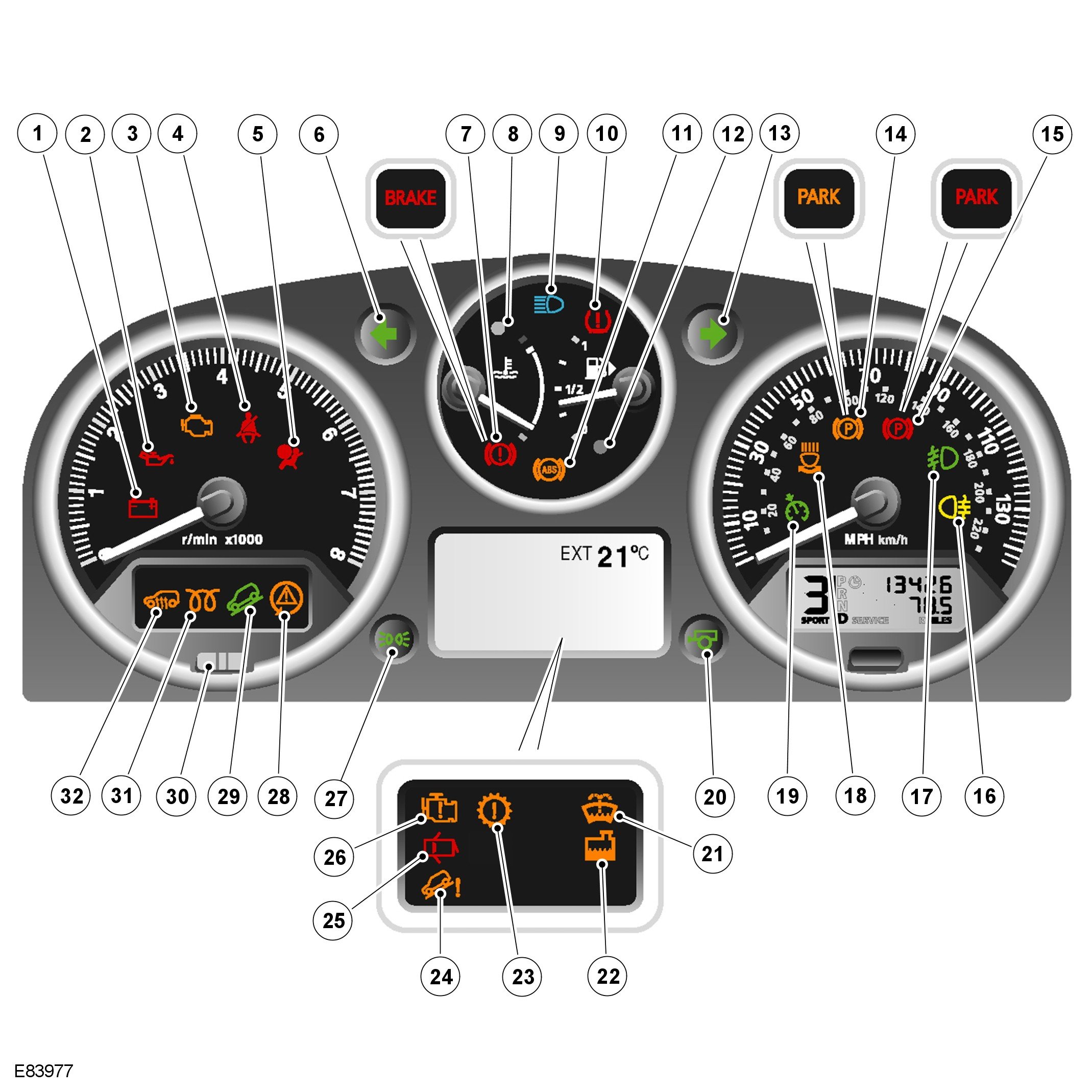 The warning indicators can be split into 2 groups; self controlled and externally controlled. Self controlled warning indicators are dependent on software logic within the instrument cluster for activation. Externally controlled indicators are supplied with current from another system controlling module or illuminated by the instrument cluster on receipt of a medium speed CAN bus message from the CJB.