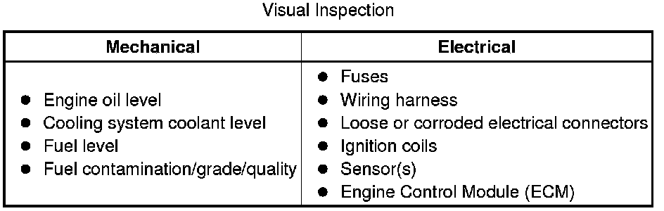 4 If the cause is not visually evident, verify the symptom and refer to the Symptom Chart, alternatively, check for Diagnostic Trouble Codes (DTCs) and refer to the DTC Index.