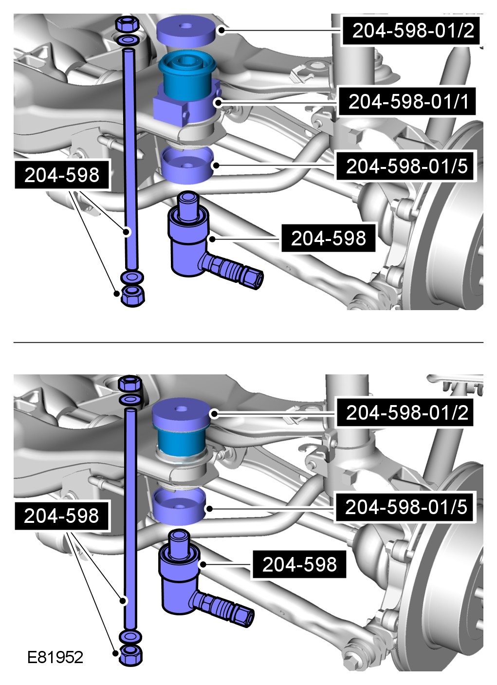 CAUTION: Special tool 204-598-01/8 is used to start the bushing removal process, and must be removed after the bushing has released, as it will not pass through the subframe bushing aperture.