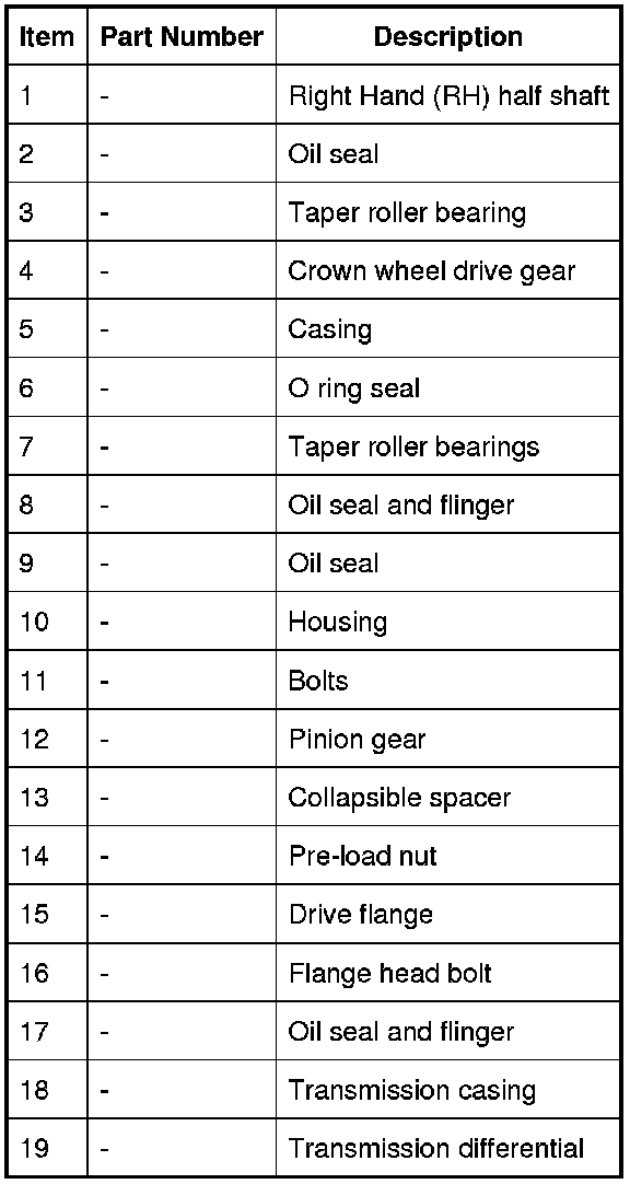 Drive from the transmission differential drives the crown wheel drive gear, which in turn rotates the pinion gear. Drive is passed from the pinion gear to the drive shaft and the rear differential via the drive flange attached to the pinion gear shaft.