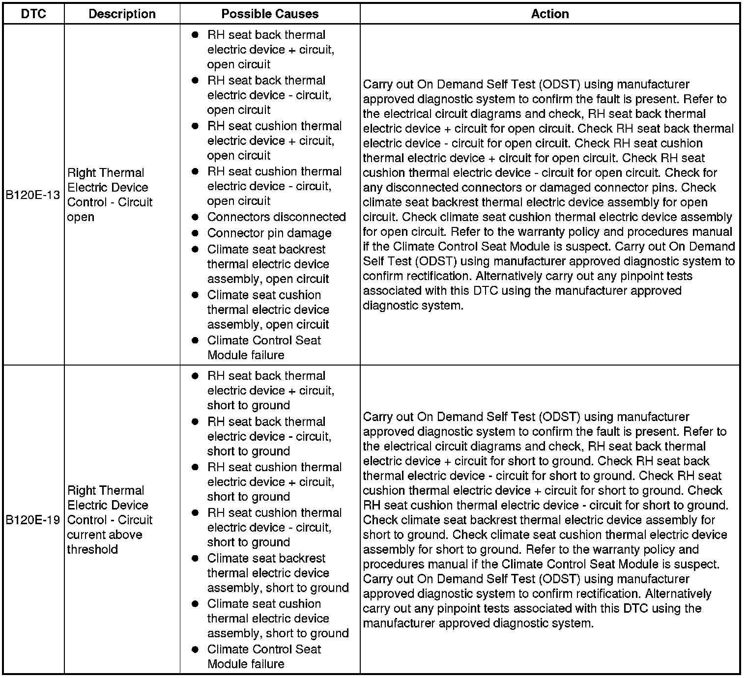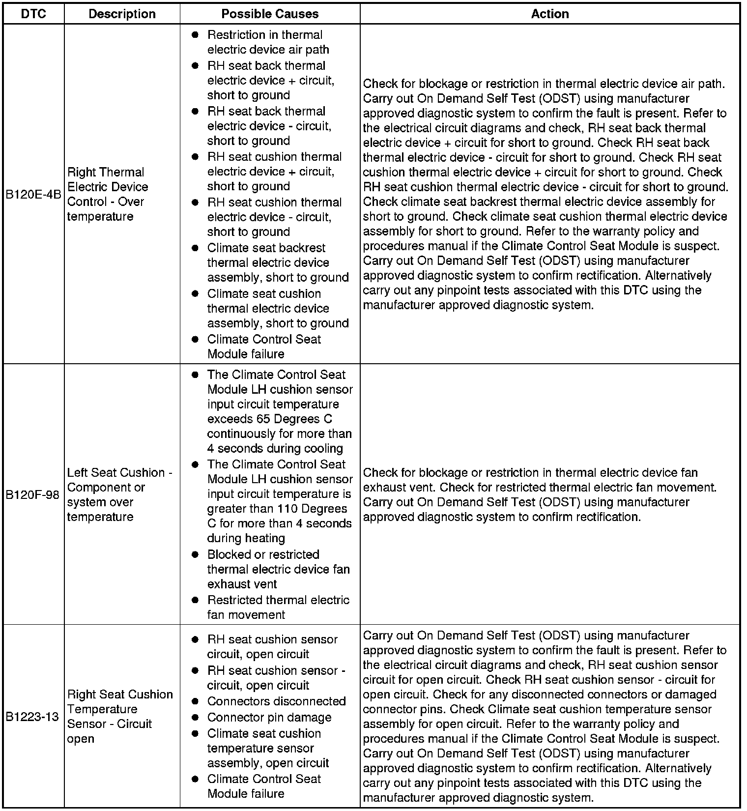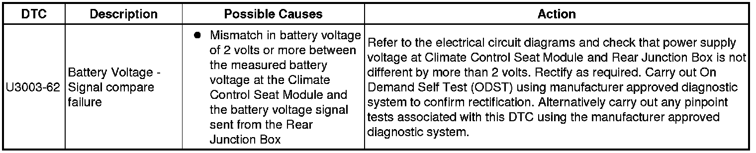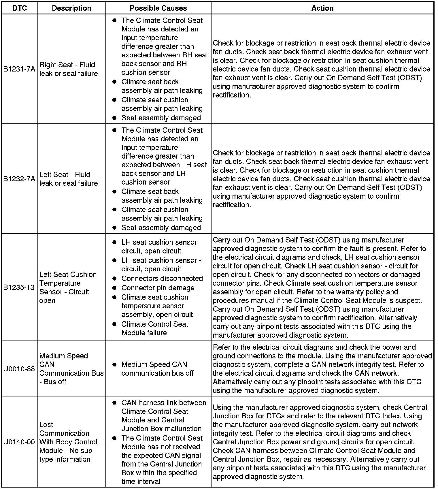 The table below lists all Diagnostic Trouble Codes (DTCs) that could be logged in the Climate Controlled Seat Module - Front/Rear (SCME/SCMF), for additional Diagnosis and Testing information refer to the relevant Diagnosis and Testing Section. For additional information, refer to Seats Initial Inspection and Diagnostic Overview
