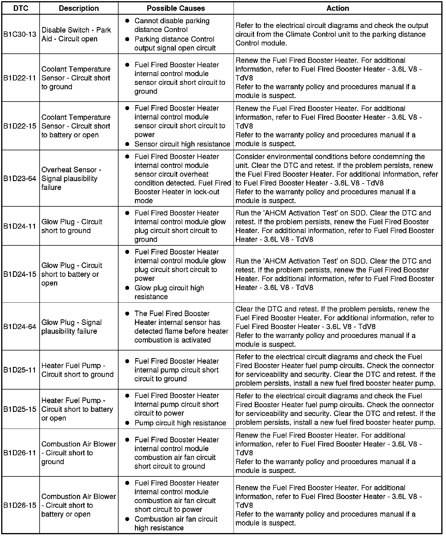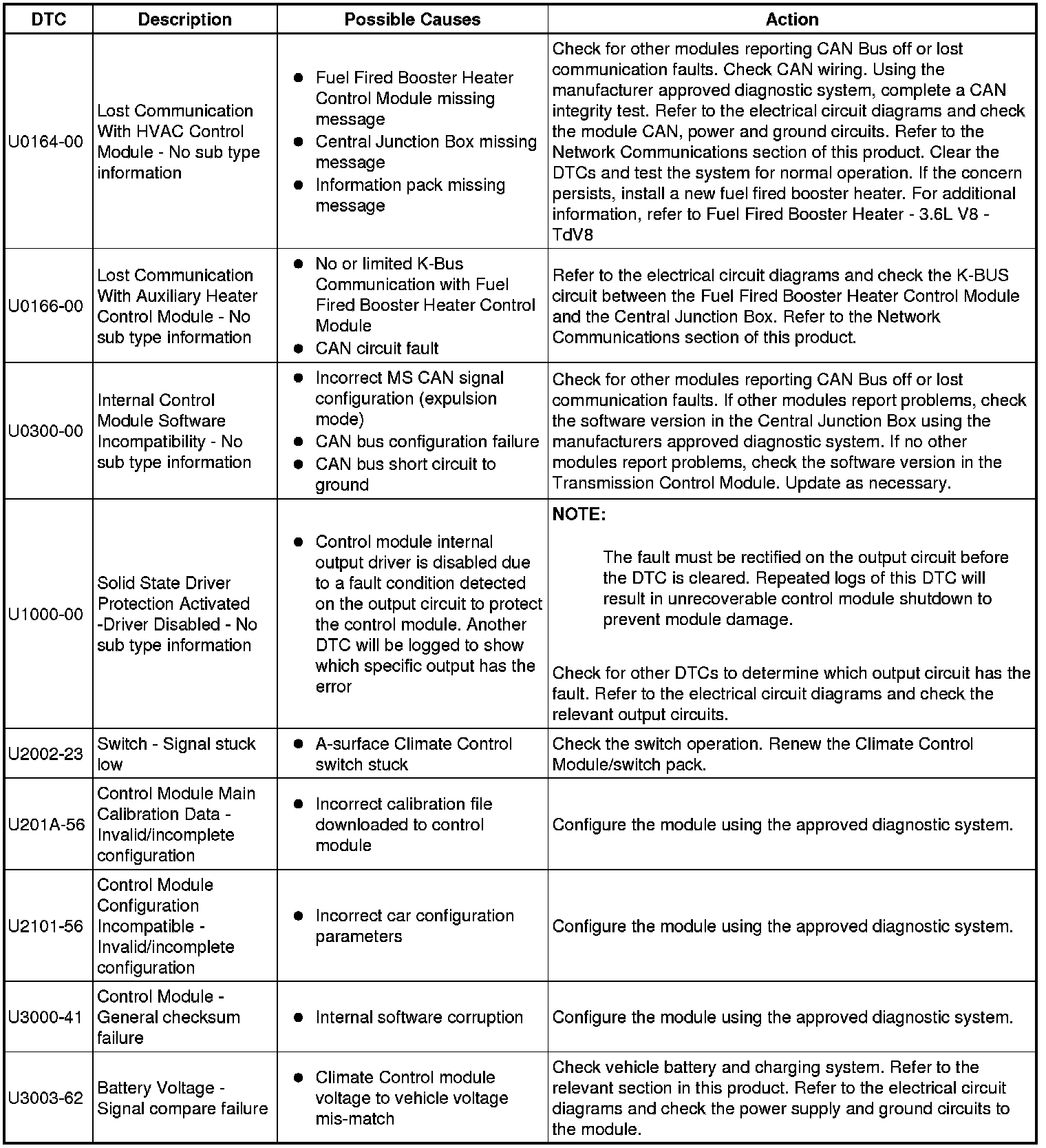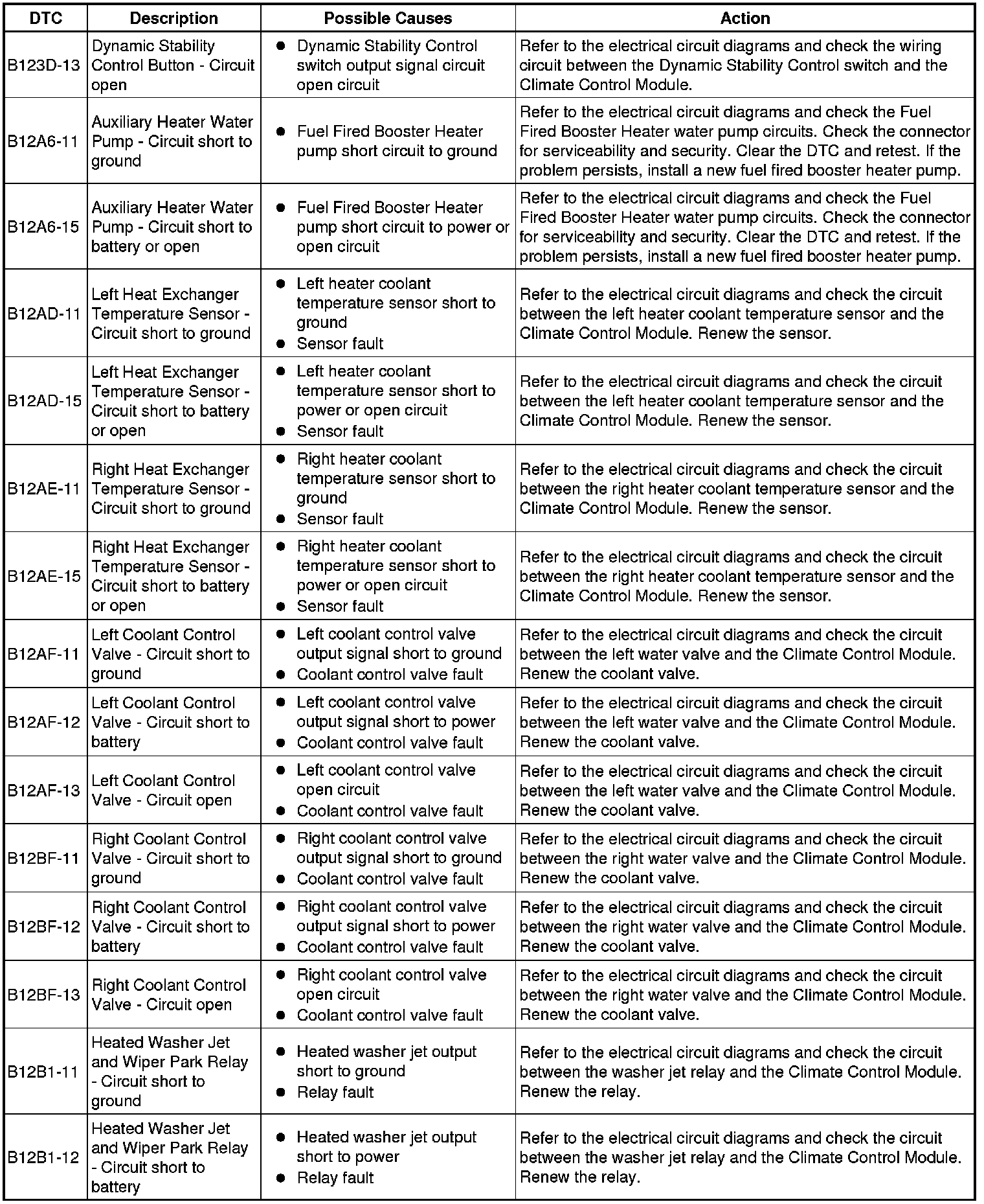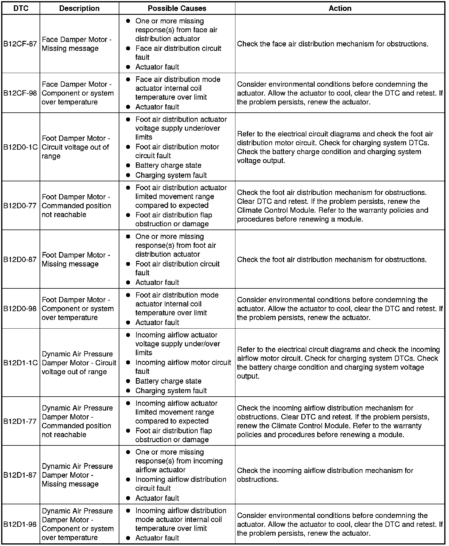 The table below lists all Diagnostic Trouble Codes (DTCs) that could be logged in the Climate Control Module, for additional Diagnosis and Testing information refer to the relevant Diagnosis and Testing Section. For additional information, refer to Climate Control System Testing and Inspection
