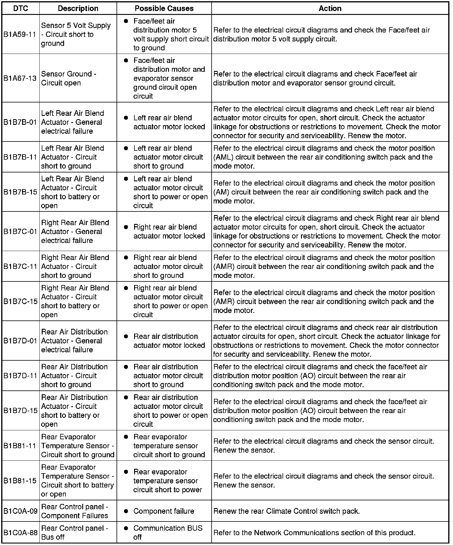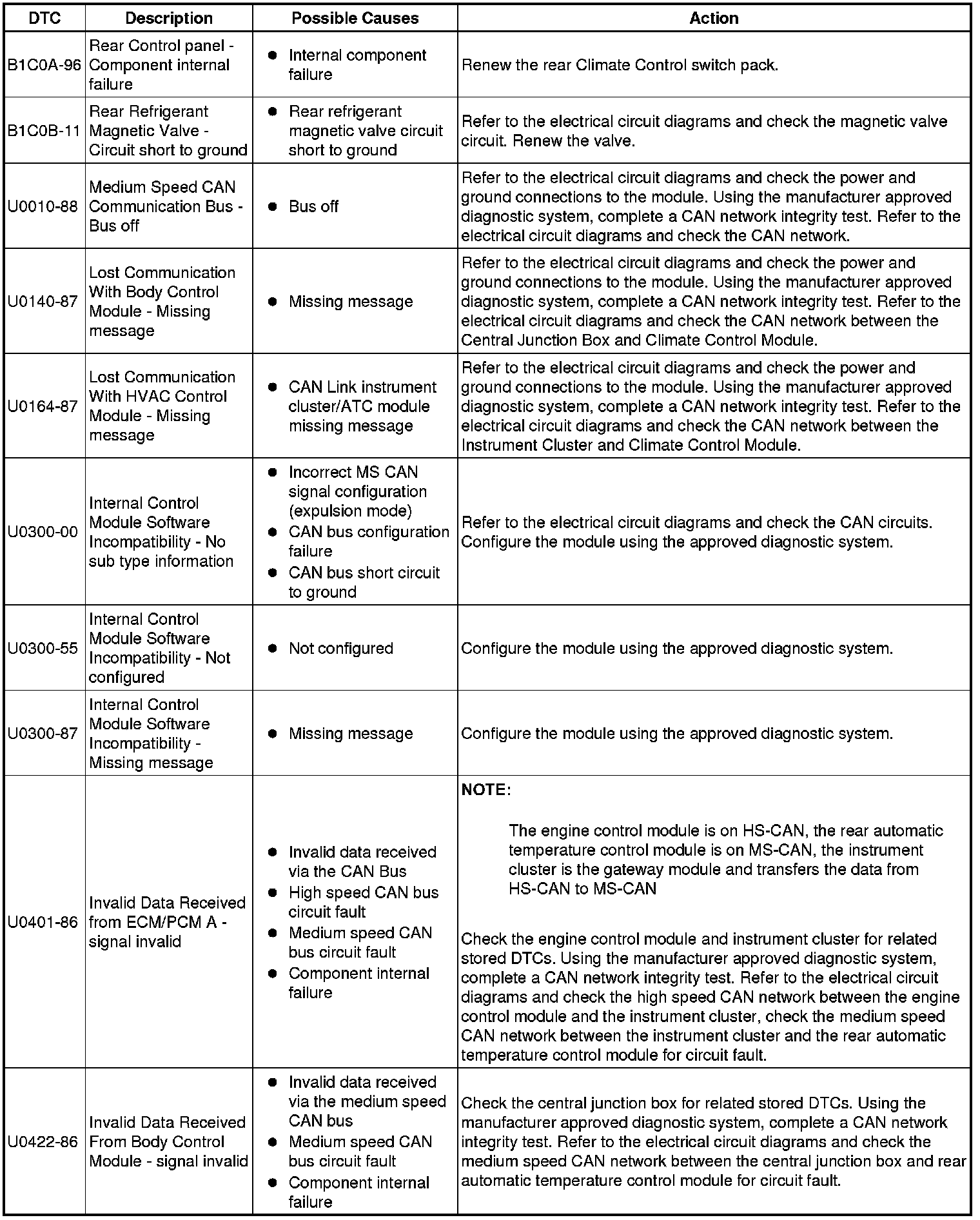 The table below lists all Diagnostic Trouble Codes (DTCs) that could be logged in the Climate Control Module, for additional Diagnosis and Testing information refer to the relevant Diagnosis and Testing Section. For additional information, refer to Climate Control System Testing and Inspection