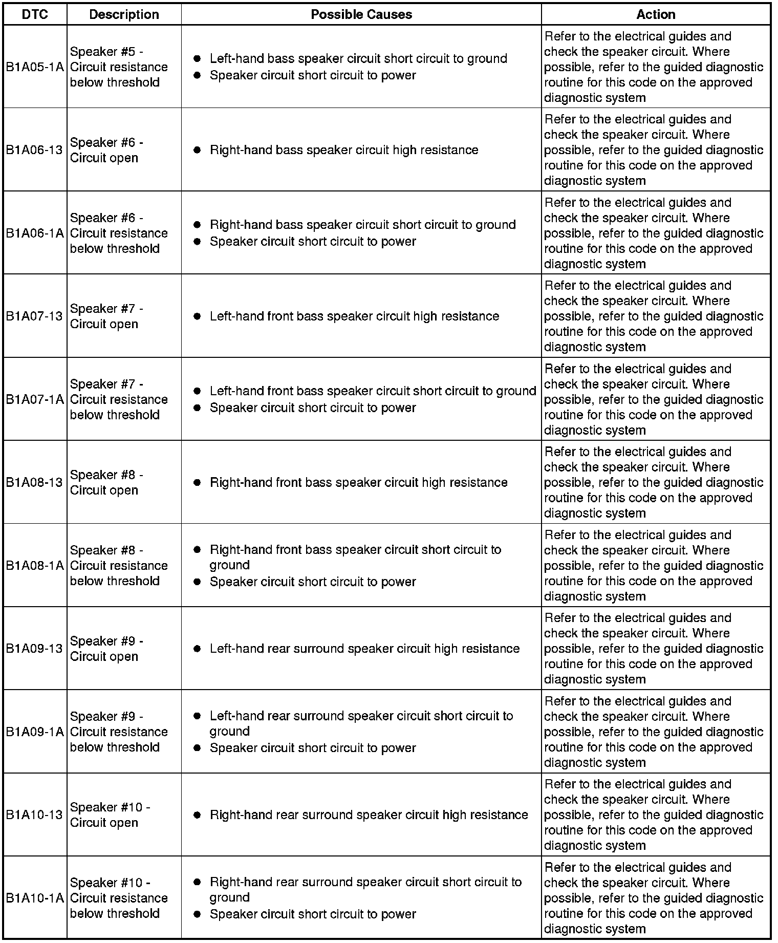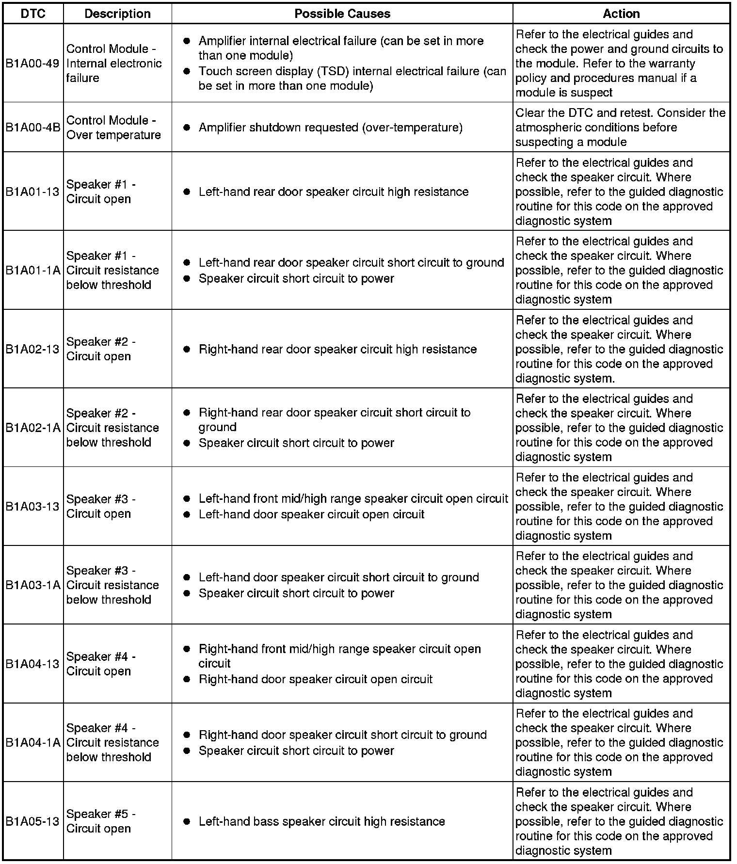 The table below lists all Diagnostic Trouble Codes (DTCs) that could be logged in the Audio Amplifier Module, for additional Diagnosis and Testing information refer to the relevant Diagnosis and Testing Section. For additional information, refer to Information and Entertainment System Information and Entertainment System