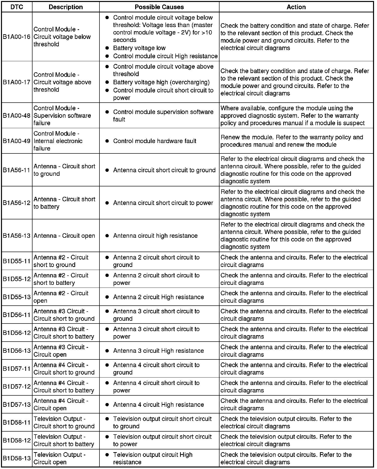 The table below lists all Diagnostic Trouble Codes (DTCs) that could be logged in the Television Control Module, for additional Diagnosis and Testing information refer to the relevant Diagnosis and Testing Section. For additional information, refer to Information and Entertainment System Information and Entertainment System