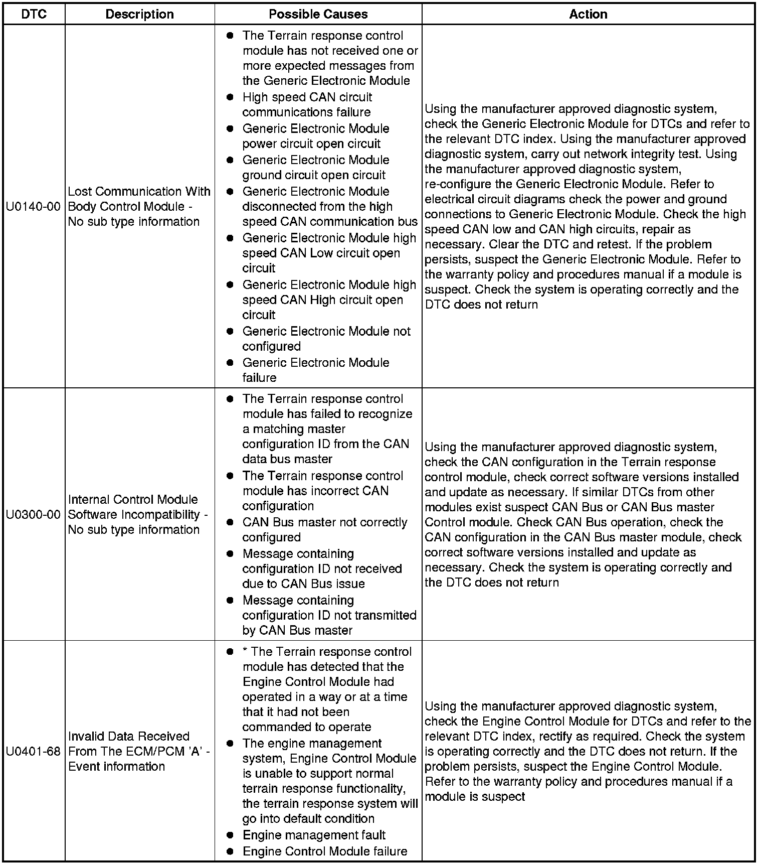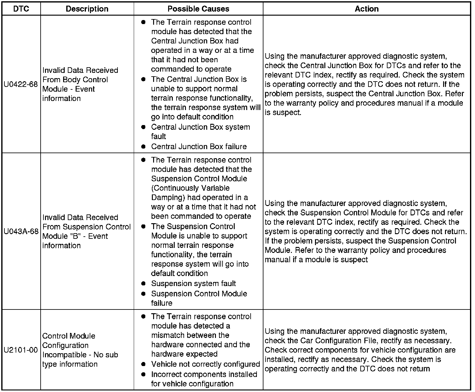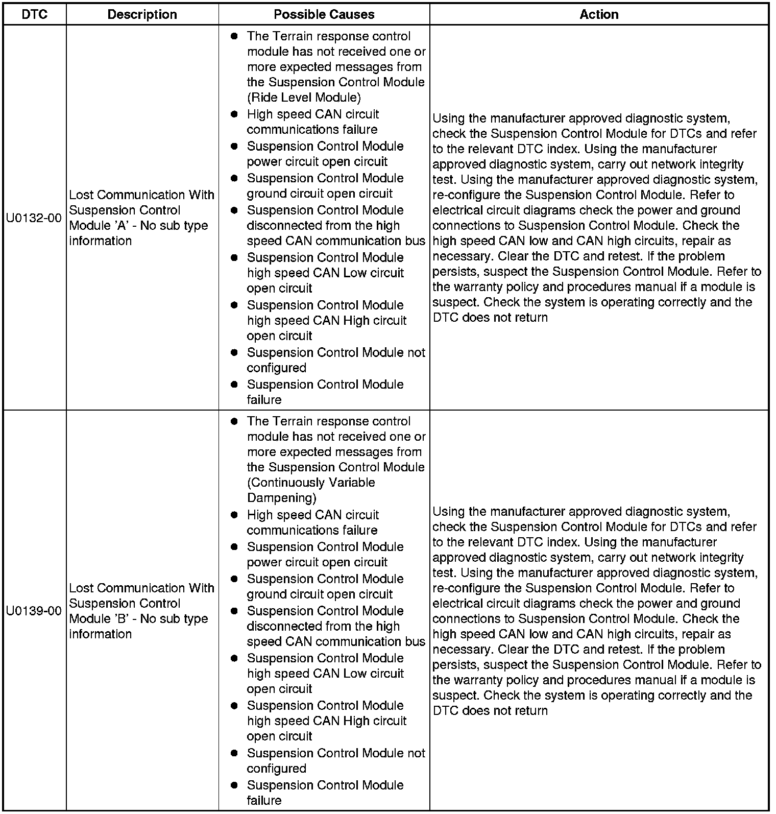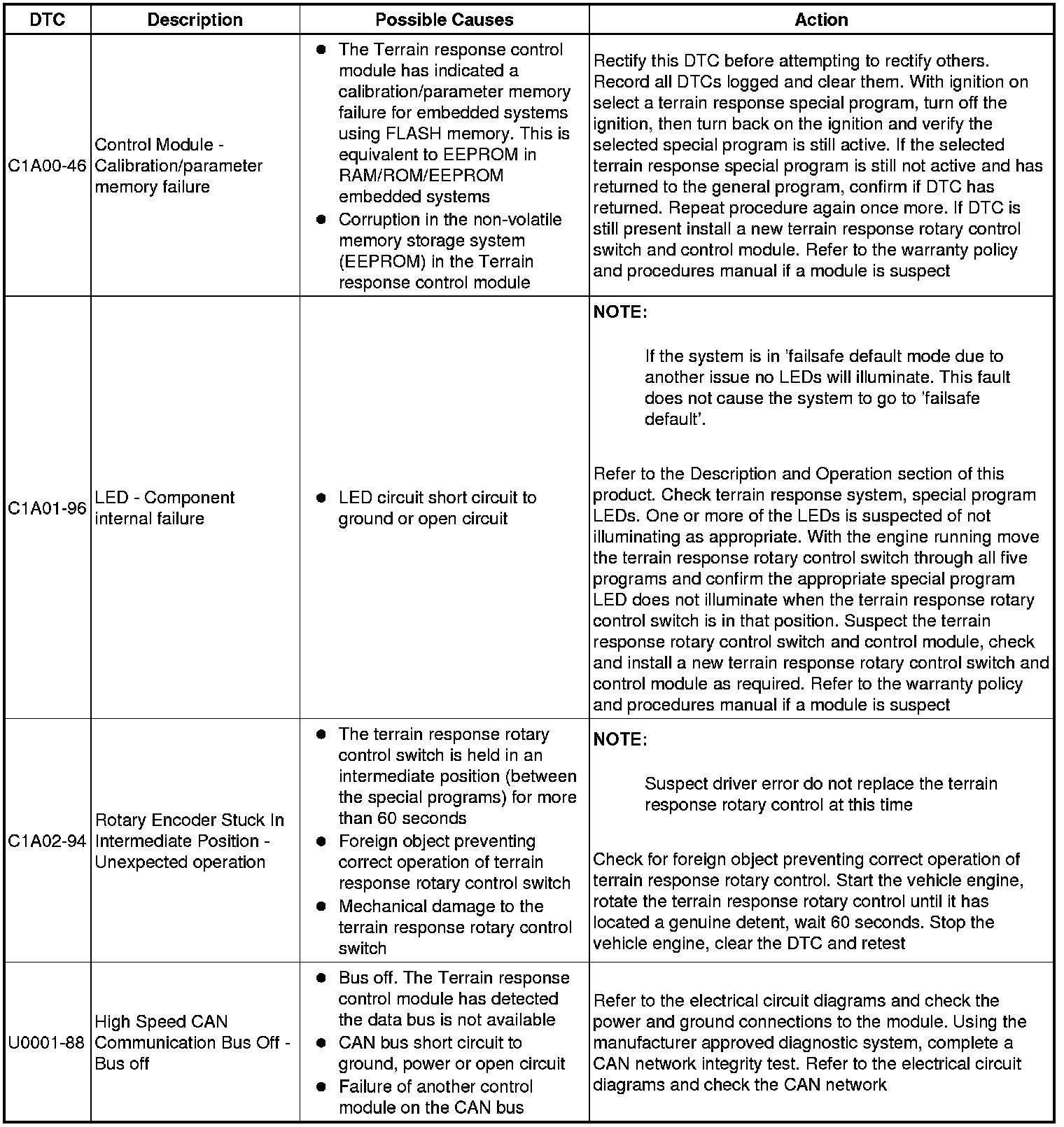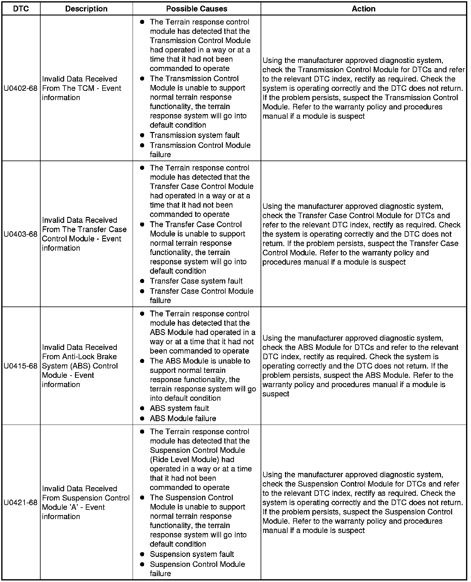 The table below lists all Diagnostic Trouble Codes (DTCs) that could be logged in the All Terrain Control Module, for additional Diagnosis and Testing information refer to the relevant Diagnosis and Testing Section. For additional information, refer to Ride and Handling Optimization Ride and Handling Optimization