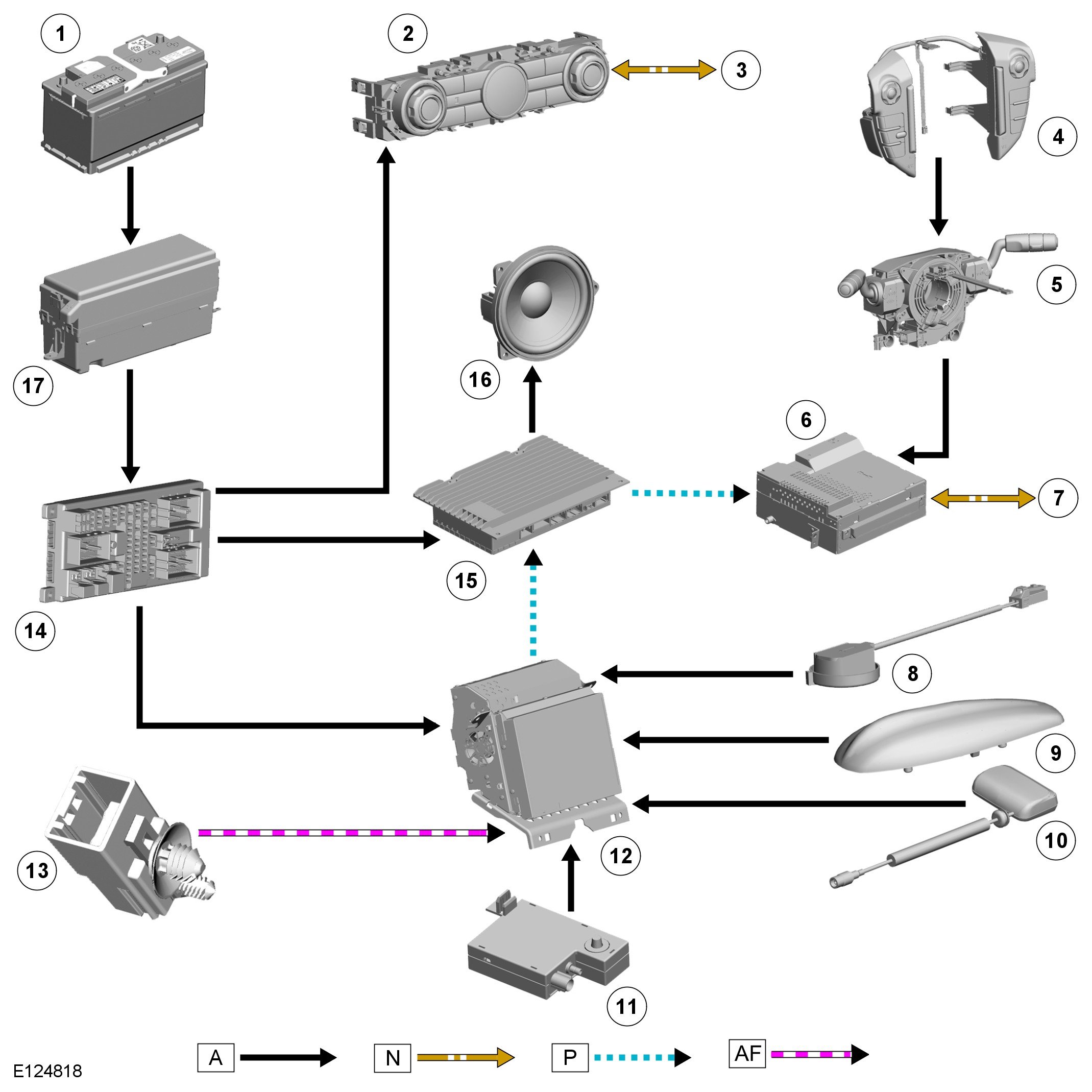 A = Hardwired; N = Medium Speed CAN; P = MOST; AF = Firewire.