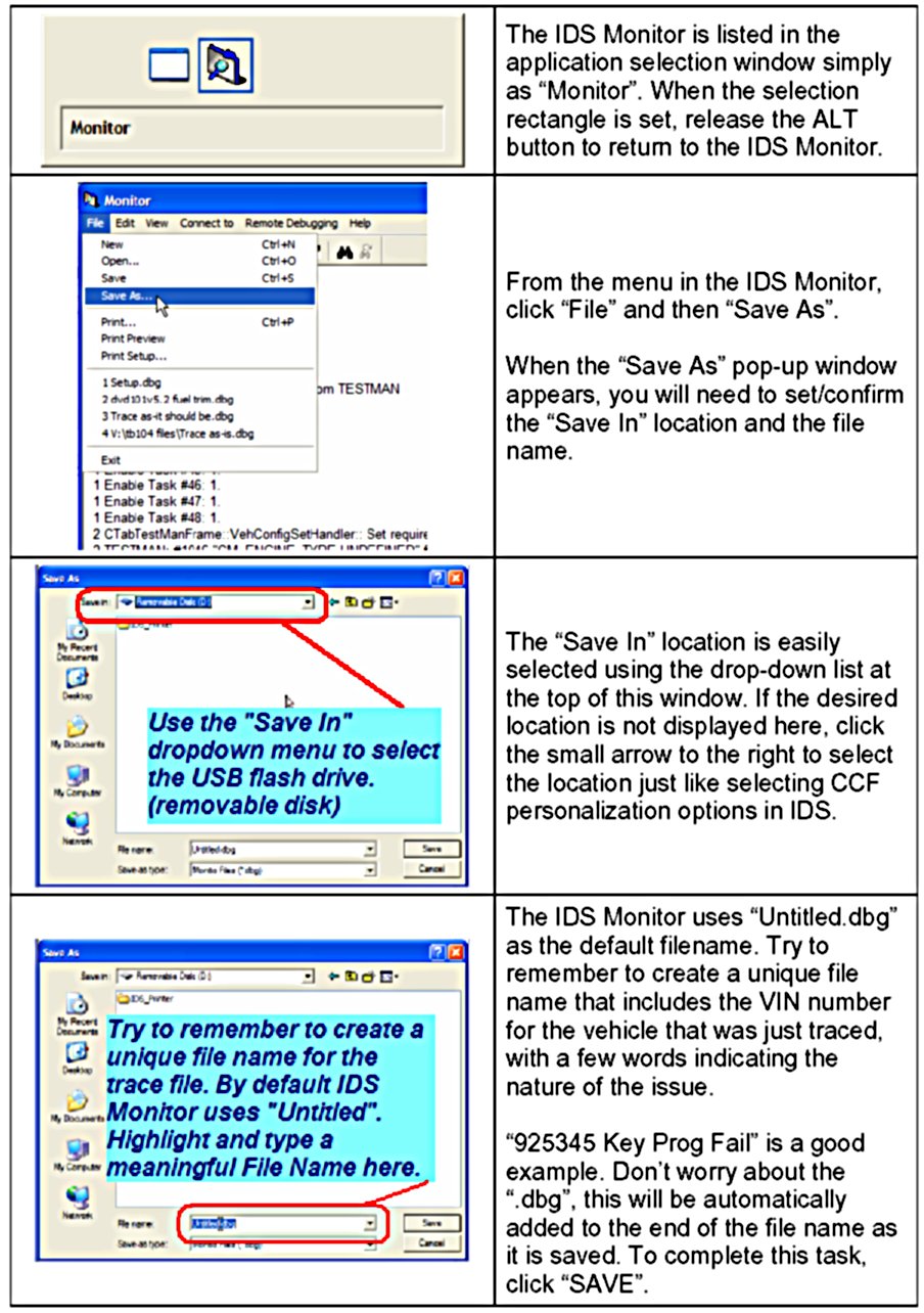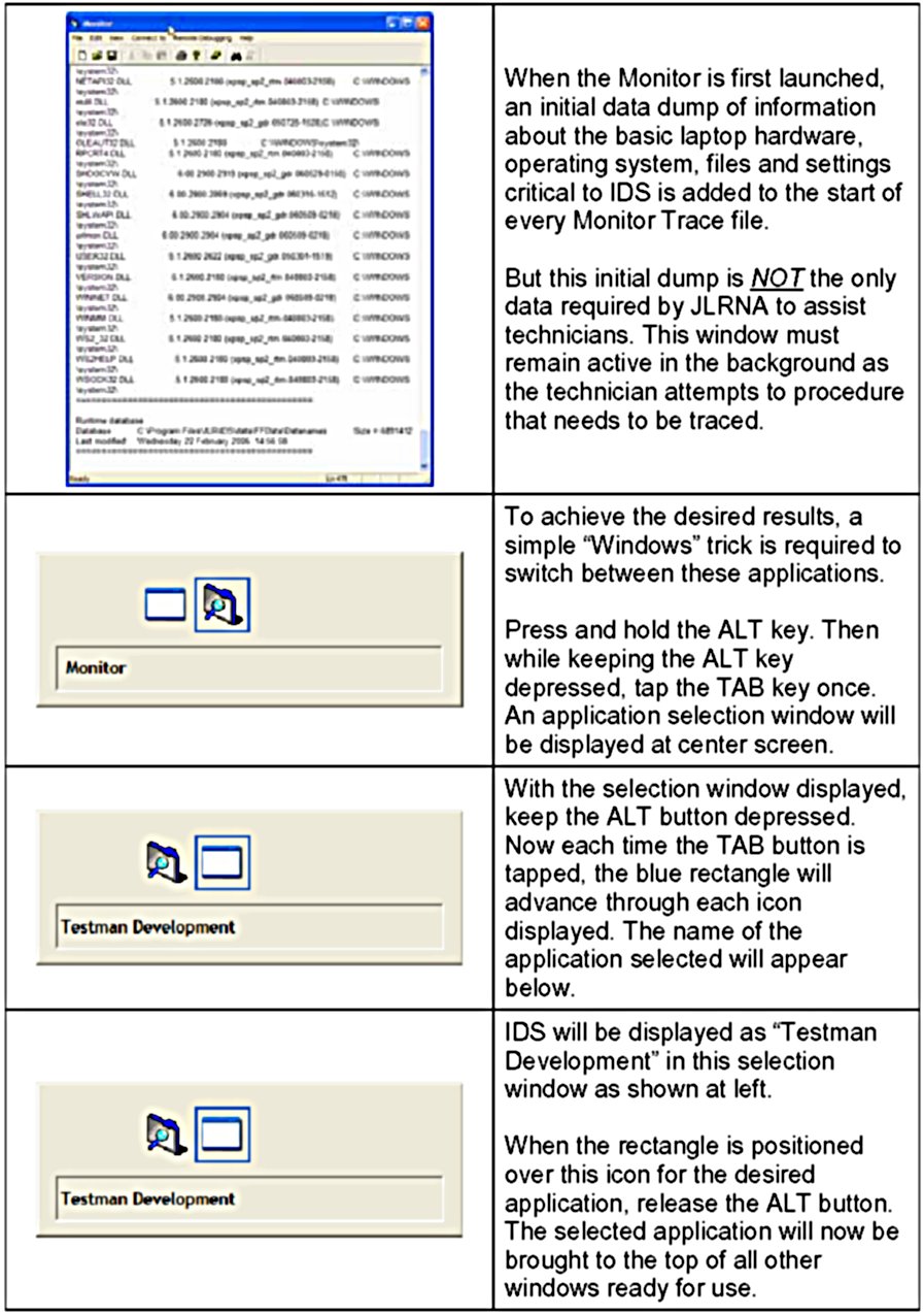 10. Currently, the only way to transfer IDS Monitor Trace files to JLRNA is via E-mail, be prepared to forward this file when requested.