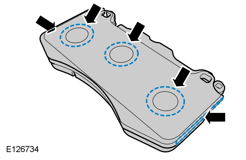 7 Apply grease LR020972 (Molykote CU7439 plus) to the areas indicated on the brake pads.